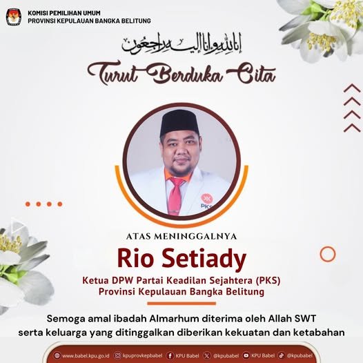 #SeperadikPemilih Keluarga besar KPU Provinsi Kepulauan Bangka Belitung mengucapkan duka mendalam atas meninggalnya Bapak Rio Setiady (Ketua DPW Partai Keadian Sejahtera Provinsi Kepulauan Bangka Belitung).