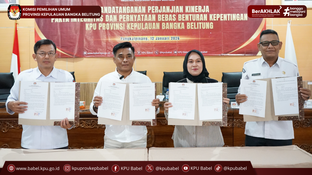 KPU Babel melaksanakan Kegiatan Penandatanganan Perjanjian Kinerja Tahun 2026 yang dihadiri oleh Ketua dan Anggota KPU Babel, Sekretaris, para Kepala Bagian, Kepala Subbagian, serta seluruh staf KPU Babel. Kegiatan ini merupakan bagian dari upaya penguatan tata kelola organisasi dan akuntabilitas kinerja aparatur.