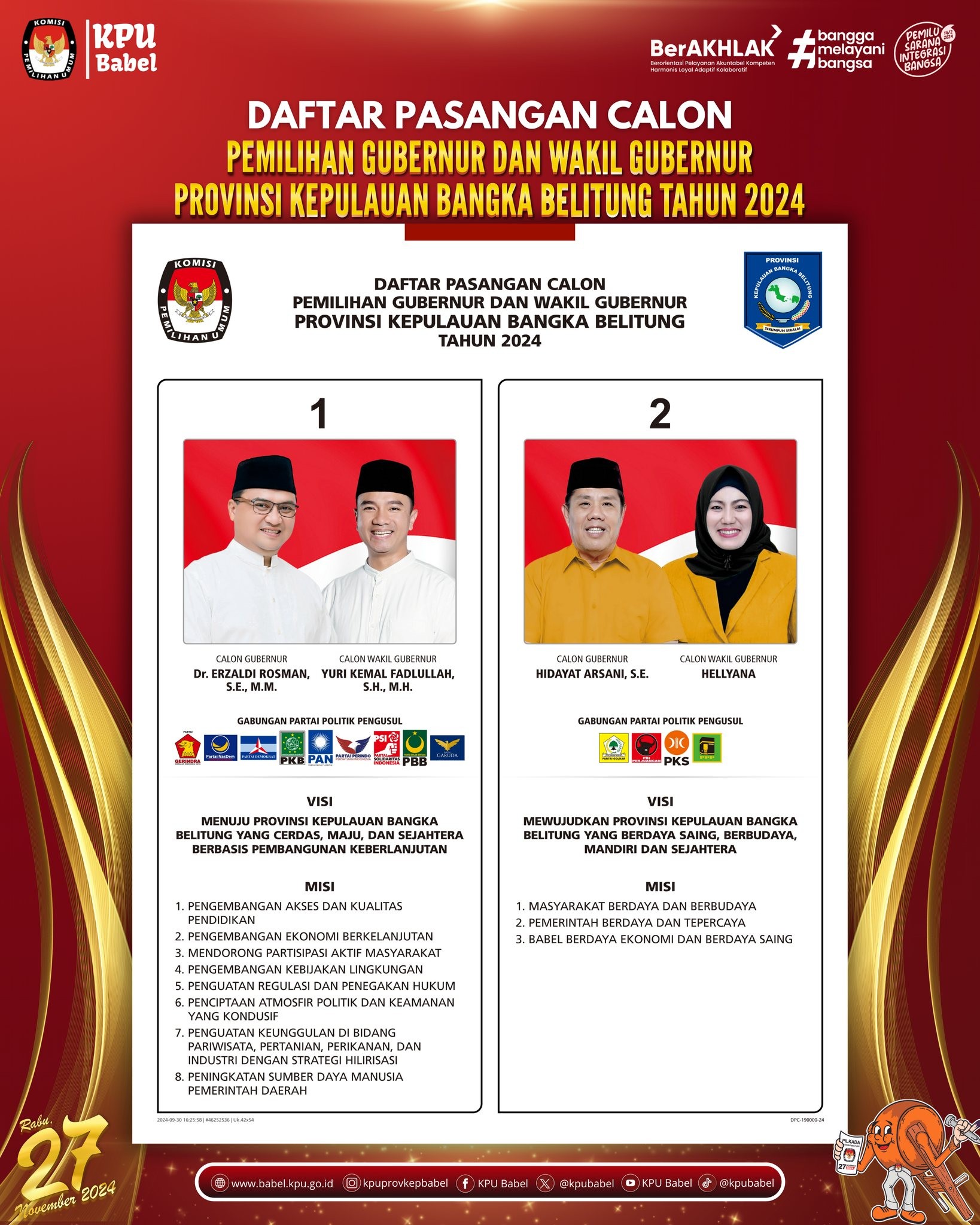#SeperadikPemilih, Berikut Daftar Pasangan Calon Pemilihan Gubernur dan Wakil Gubernur Provinsi Kepulauan Bangka Belitung Tahun 2024.