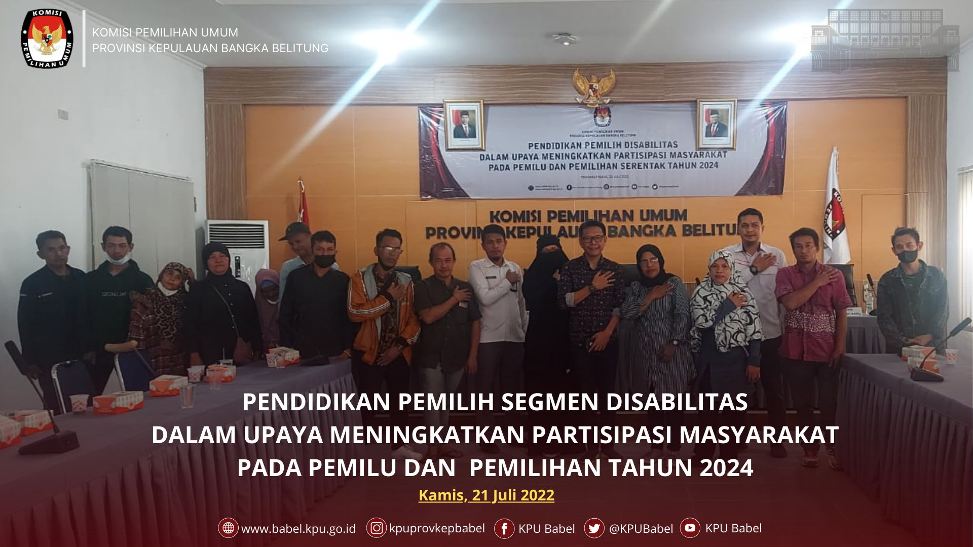 KPU Provinsi Kepulauan Bangka Belitung menggelar kegiatan Pendidikan Pemilih Segmen Disabilitas sebagai upaya meningkatkan partisipasi masyarakat dalam pemilu dan pemilihan tahun 2024. Kegiatan pendidikan pemilih dilaksanakan di Ruang Rapat KPU Babel (21/7). Kegiatan dibuka dengan sambutan dari Anggota KPU Babel Divisi Sosialisasi, Parmas dan SDM, Fahrurrozi. Dalam sambutannya, ia menyampaikan tentang perkembangan informasi terkait persiapan pemilu dan pemilihan selanjutnya serta mengajak untuk bekerjasama dalam mensukseskan pemilu dan pemilihan di tahun 2024 dilanjutkan dengan pengarahan Anggota KPU Babel Divisi Hukum, Deni dan Divisi Teknis, Husin.