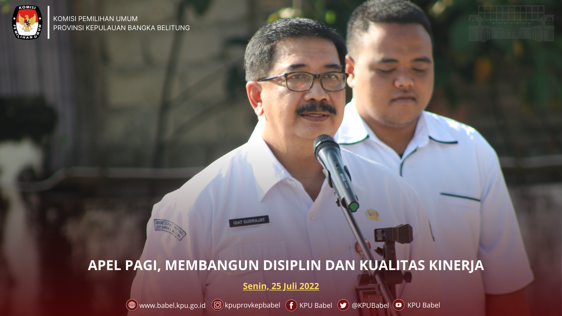 pangkalpinang, babel.kpu.go.id - Tepat pukul 08.00 WIB. Bertempat di halaman kantor Komisi Pemilihan Umum (KPU) jajaran sekretariat KPU Provinsi Kepulauan Bangka Belitung melakukan apel pagi, apel tersebut dipimpin langsung Sekretaris KPU Provinsi Kepulauan Bangka Belitung, Bapak Drs.Idat Sudrajat, MM (25/06)