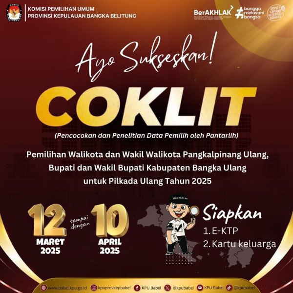 #SeperadikPemilih Ayo sukseskan COKLIT (Pencocokan dan Penelitian) Data Pemilih oleh Pantarlih yang berlangsung dari tanggal 12 Maret 2025 - 10 April 2025.