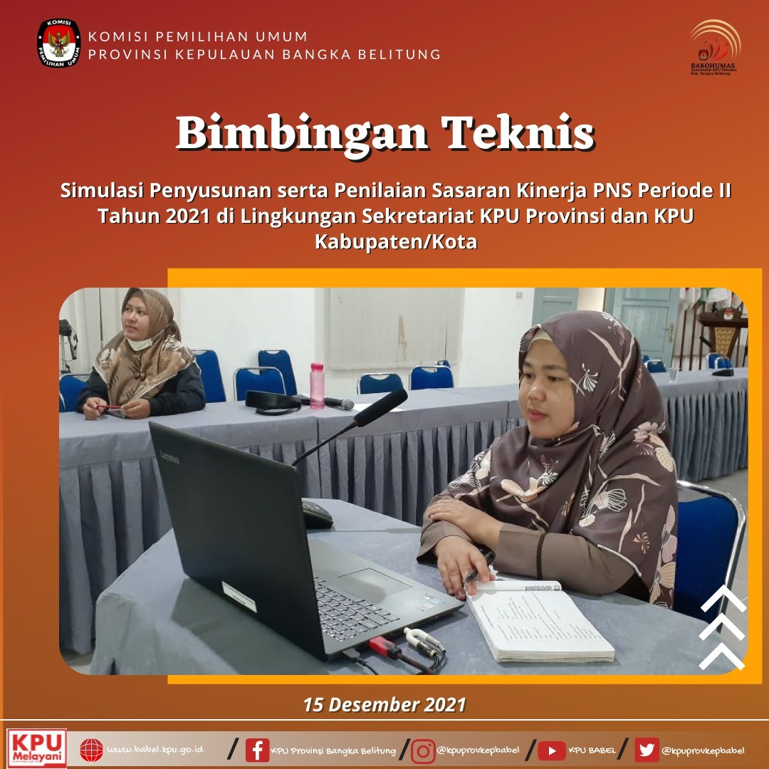 Pangkalpinang, Rabu (15/12/2021) - Sekretariat Komisi Pemilihan Umum Provinsi Kepulauan Bangka Belitung mengikuti kegiatan "Bimbingan Teknis dan Simulasi Penyusunan serta Penilaian Sasaran Kinerja PNS Periode II Tahun 2021 di Lingkungan Sekretariat KPU Provinsi dan KPU Kabupaten/Kota" yang diselenggarakan oleh KPU RI @kpu_ri