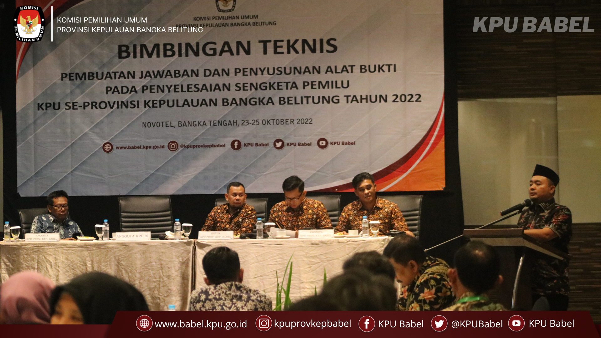 Bangka Tengah, babel.kpu.go.id - #SeperadikPemilih KPU Provinsi Kepulauan Bangka Belitung menyelenggarakan Bimbingan Teknis Pembuatan Jawaban dan Penyusunan Alat Bukti pada Penyelesaian Sengketa Pemilu KPU Provinsi dan KPU Kabupaten/Kota Se-Provinsi Kepulauan Bangka Belitung. Kegiatan yang berlangsung di Hotel Novotel Kabupaten Bangka Tengah ini dihadiri oleh Mochamad Afifuddin Divisi Hukum Pengawasan KPU Republik Indonesia. (23/10/22)
