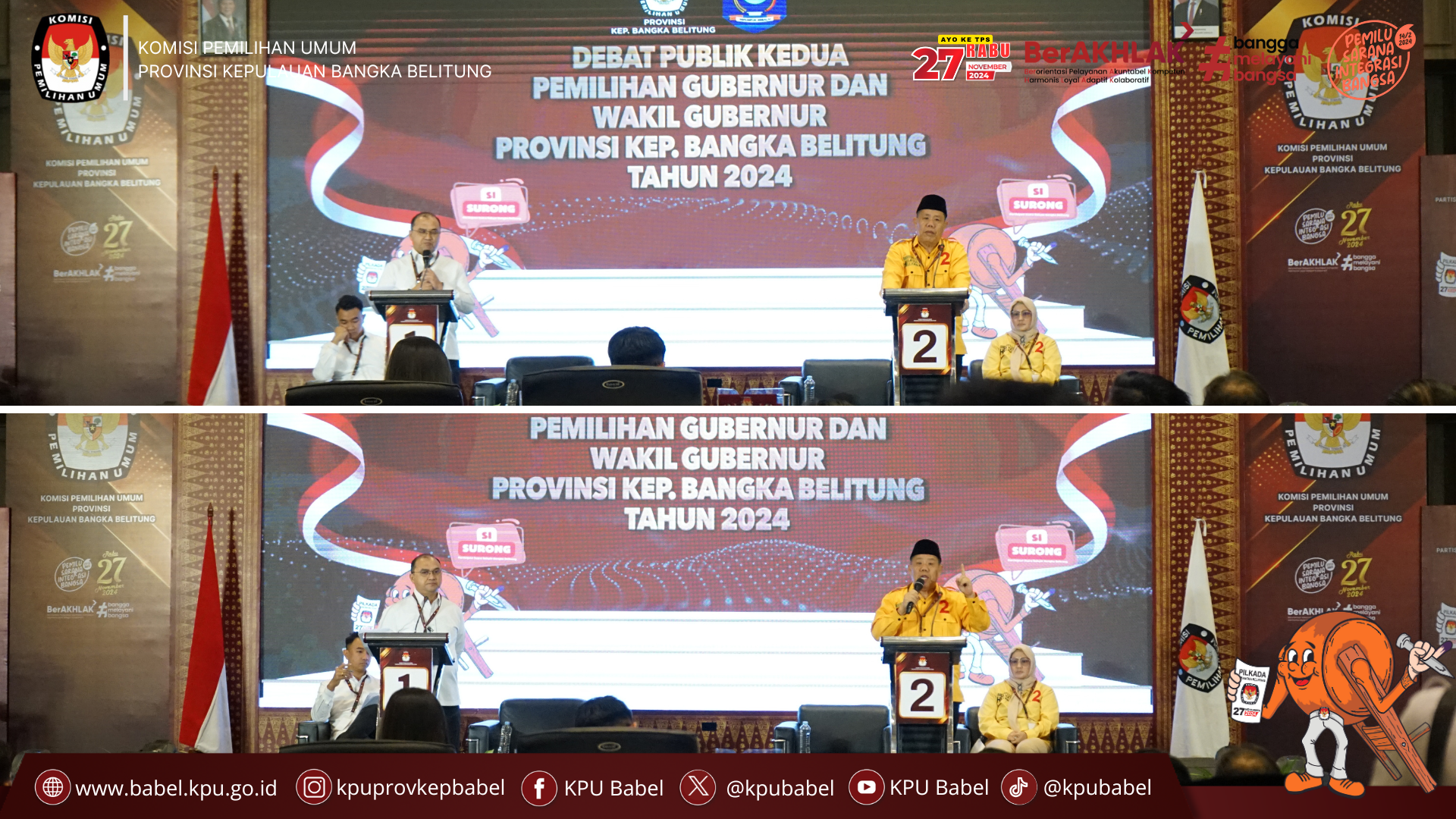 #SeperadikPemilih, Debat publik kedua pasangan calon Gubernur dan Wakil Gubernur Kepulauan Bangka Belitung untuk Pemilihan 2024 diselenggarakan oleh Komisi Pemilihan Umum Provinsi Kepulauan Bangka Belitung pada Senin malam (18/11) di Tanjung Pandan Kabupaten Belitung bertempat di BW Suite Hotel. Debat ini mengusung tema “mewujudkan Kemajuan Daerah melalui Transformasi Ekonomi Berkelanjutan, Lingkungan Hidup yang Lestari serta Sarana dan Prasarana yang Optimal menuju Kepulauan Bangka Belitung yang Kuat, Mandiri dan Otonom”