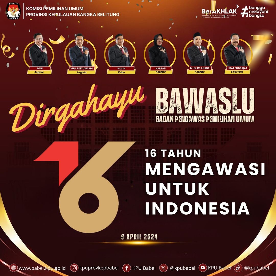 #SeperadikPemilih, Keluarga Besar Komisi Pemilihan Umum Provinsi Kepulauan Bangka Belitung mengucapkan Selamat Hari Ulang Tahun Bawaslu ke 16 Tahun.