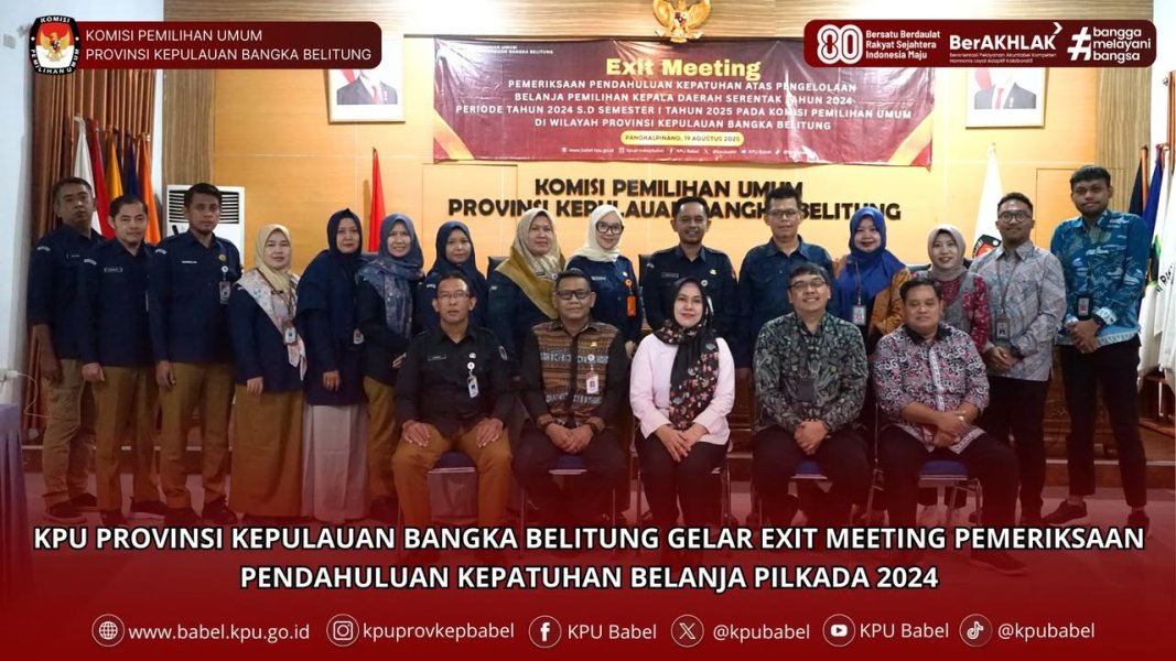 Pangkalpinang, 19 Agustus 2025 – Komisi Pemilihan Umum (KPU) Provinsi Kepulauan Bangka Belitung melaksanakan Exit Meeting Pemeriksaan Pendahuluan Kepatuhan atas Pengelolaan Belanja Pemilihan Kepala Daerah Serentak Tahun 2024 periode 2024 hingga Semester I Tahun 2025, bertempat di Ruang Rapat KPU Provinsi Kepulauan Bangka Belitung.
