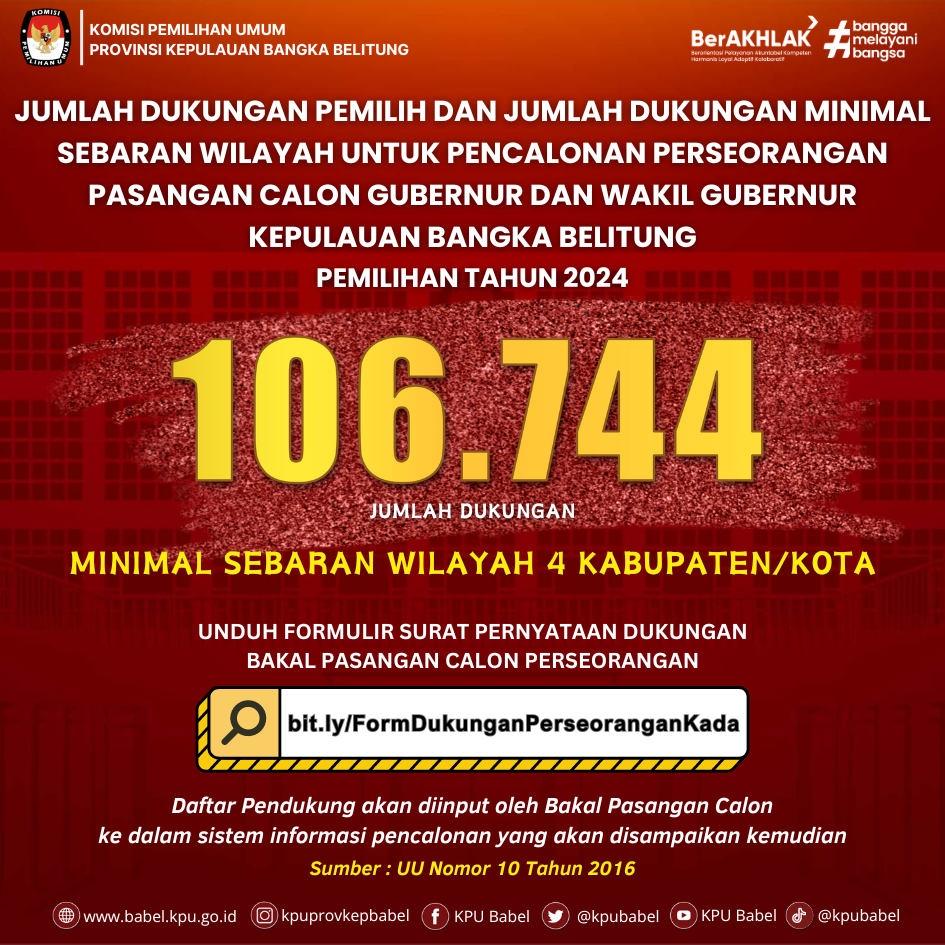 #SeperadikPemilih, berikut kami sampaikan Pengumuman Jumlah Dukungan Pemilih dan Jumlah Dukungan Minimal sebaran wilayah untuk pencalonan perseorangan pasangan calon Gubernur danWakil Gubernur Kepulauan Bangka Belitung Pemilihan Tahun 2024.