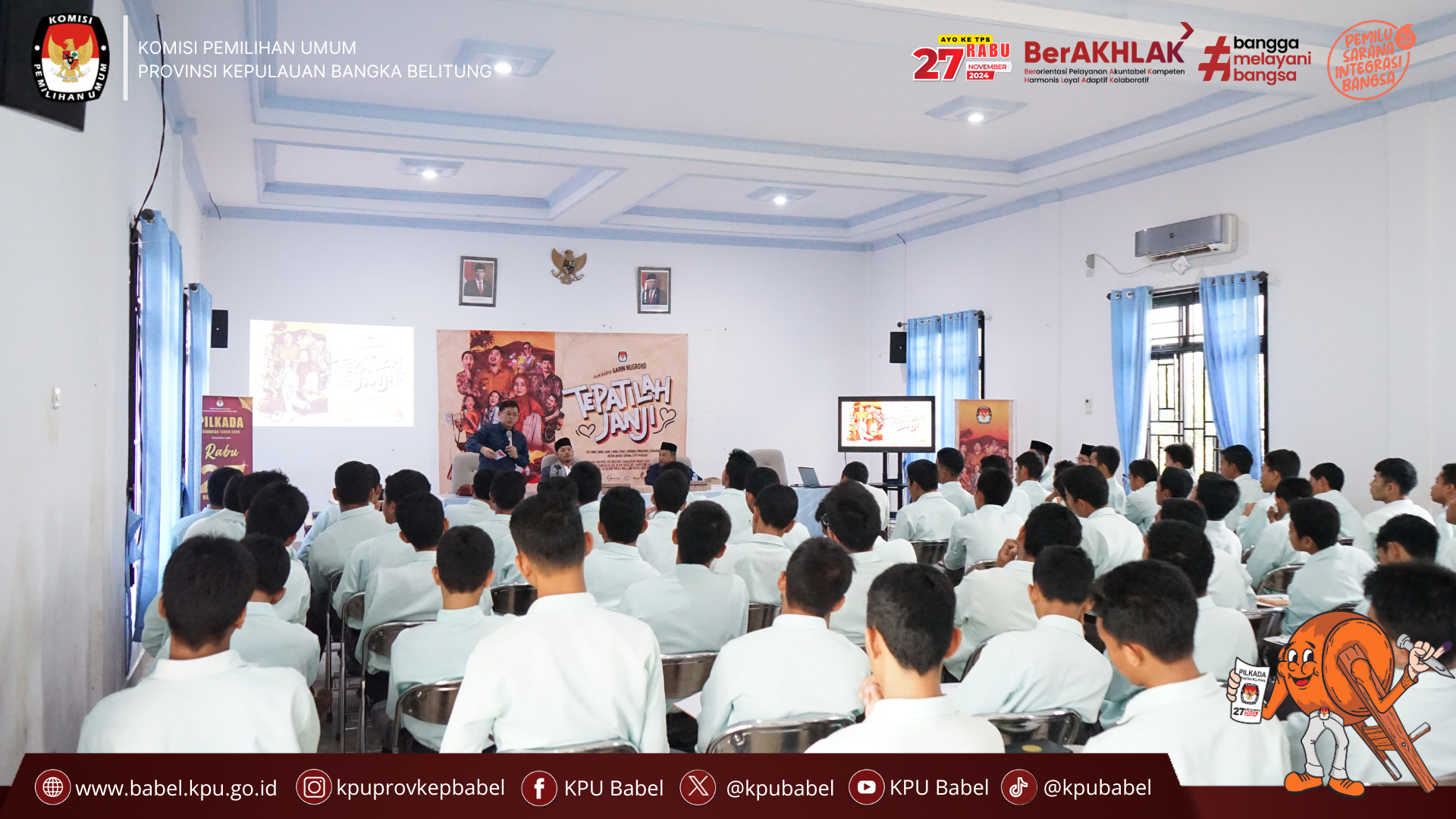 #SeperadikPemilih, Dalam rangka memperingati Hari Santri Nasional sekaligus melakukan sosialisasi Pemilihan Kepala Daerah 2024, KPU Provinsi Kepulauan Bangka Belitung menggelar acara nonton bareng film "Tepatilah Janji" di Pesantren Daarul Abror, Kabupaten Bangka, pada Senin (21/10).