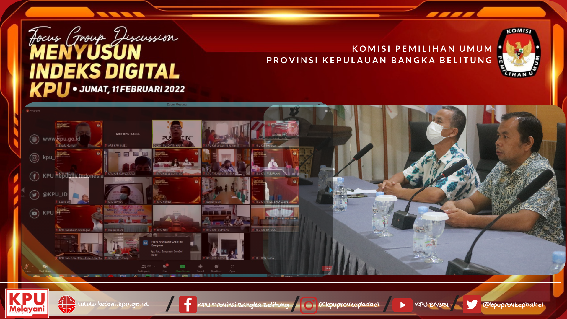 Pangkalpinang, Jum'at (11-02-2022) - Komisi Pemilihan Umum Provinsi Kepulauan Bangka Belitung mengikuti Focus Group Discussion (FGD) dengan tema Menyusun Indeks Digital KPU oleh KPU RI, melalui zoom meeting mulai pukul 09.00 WIB s.d selesai.