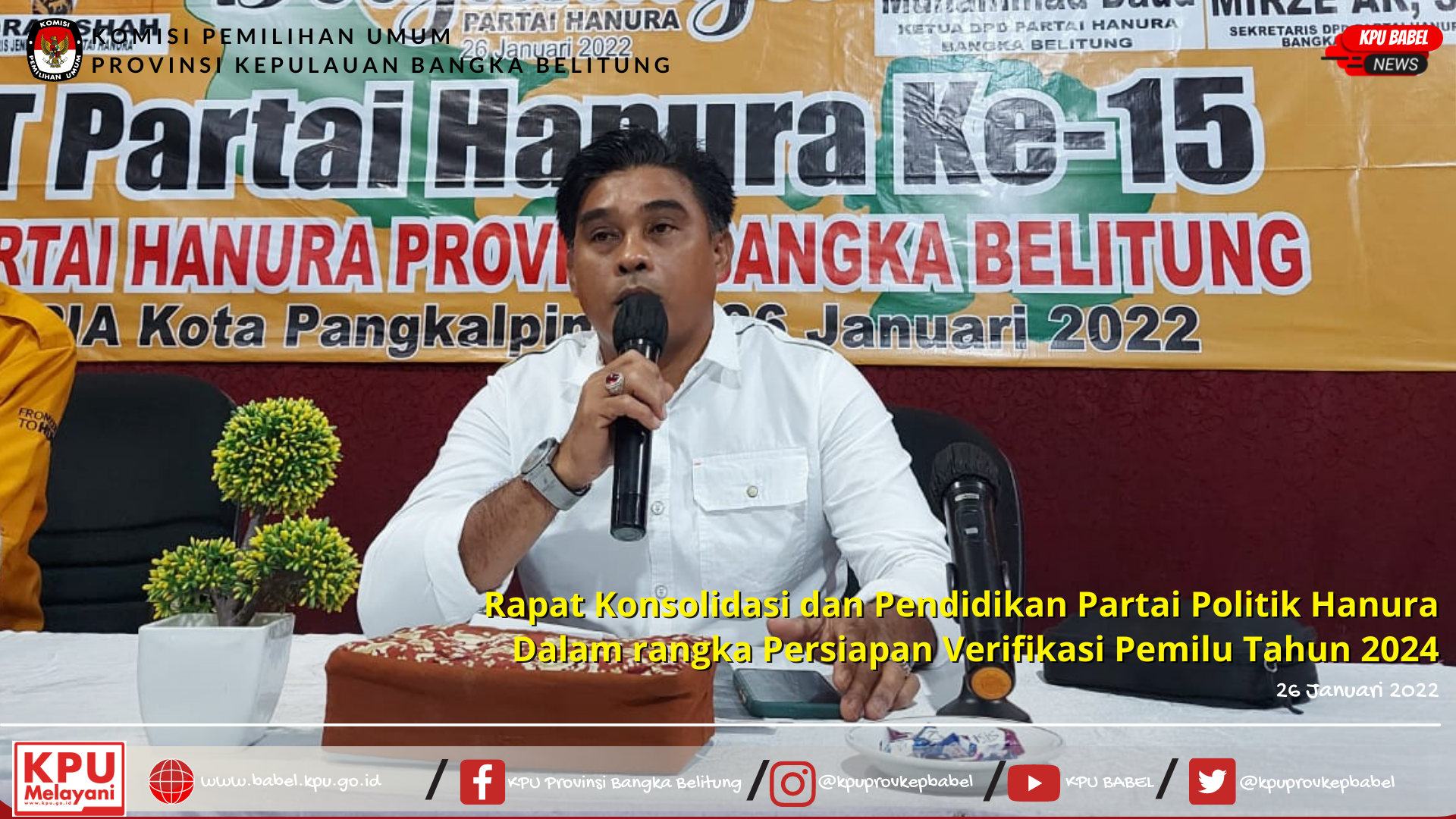 Pangkalpinang, Rabu 26/01/2022. Komisi Pemilihan Umum Provinsi Kepulauan Bangka Belitung Menghadiri Undangan Rapat Konsolidasi dan Pendidikan Politik Partai Hanura Prov.Kep.Babel. dalam hal ini diwakili oleh Komisioner Divisi Teknis Penyelenggaraan Husin.
