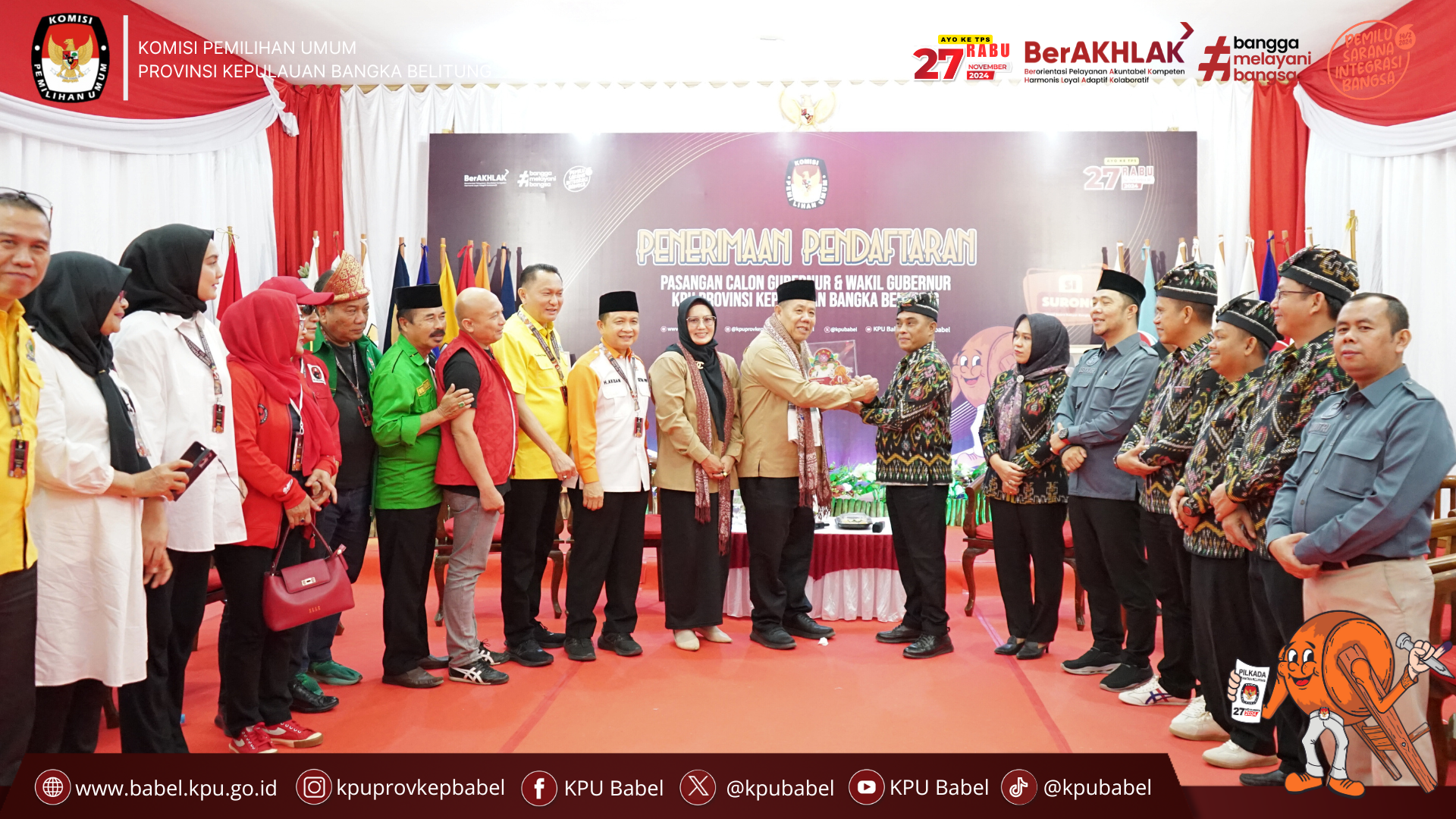 #SeperadikPemilih Komisi Pemilihan Umum Provinsi Kepulauan Bangka Belitung (KPU Babel) menerima pendaftaran Pasangan Calon Gubernur dan Wakil Gubernur Kepulauan Bangka Belitung 2024, Hidayat Arsani-Hellyana. Pendaftaran dilaksanakan di Kantor KPU Babel, Jalan Mentok Nomor 313 A Pangkalpinang, Rabu, 28 Agustus 2024.