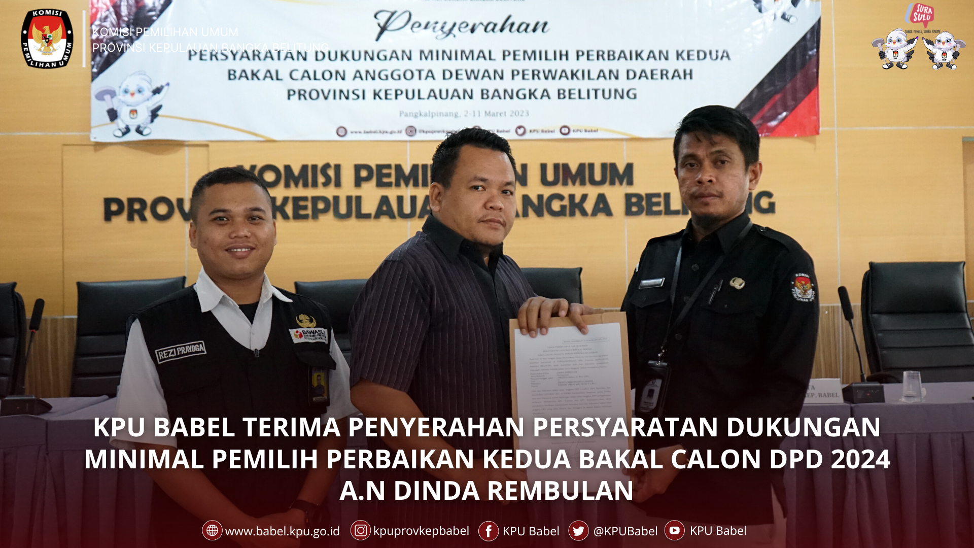 KPU BABEL TERIMA PENYERAHAN PERSYARATAN DUKUNGAN MINIMAL PEMILIH PERBAIKAN KEDUA BAKAL CALON DPD 2024 A.N DINDA REMBULAN