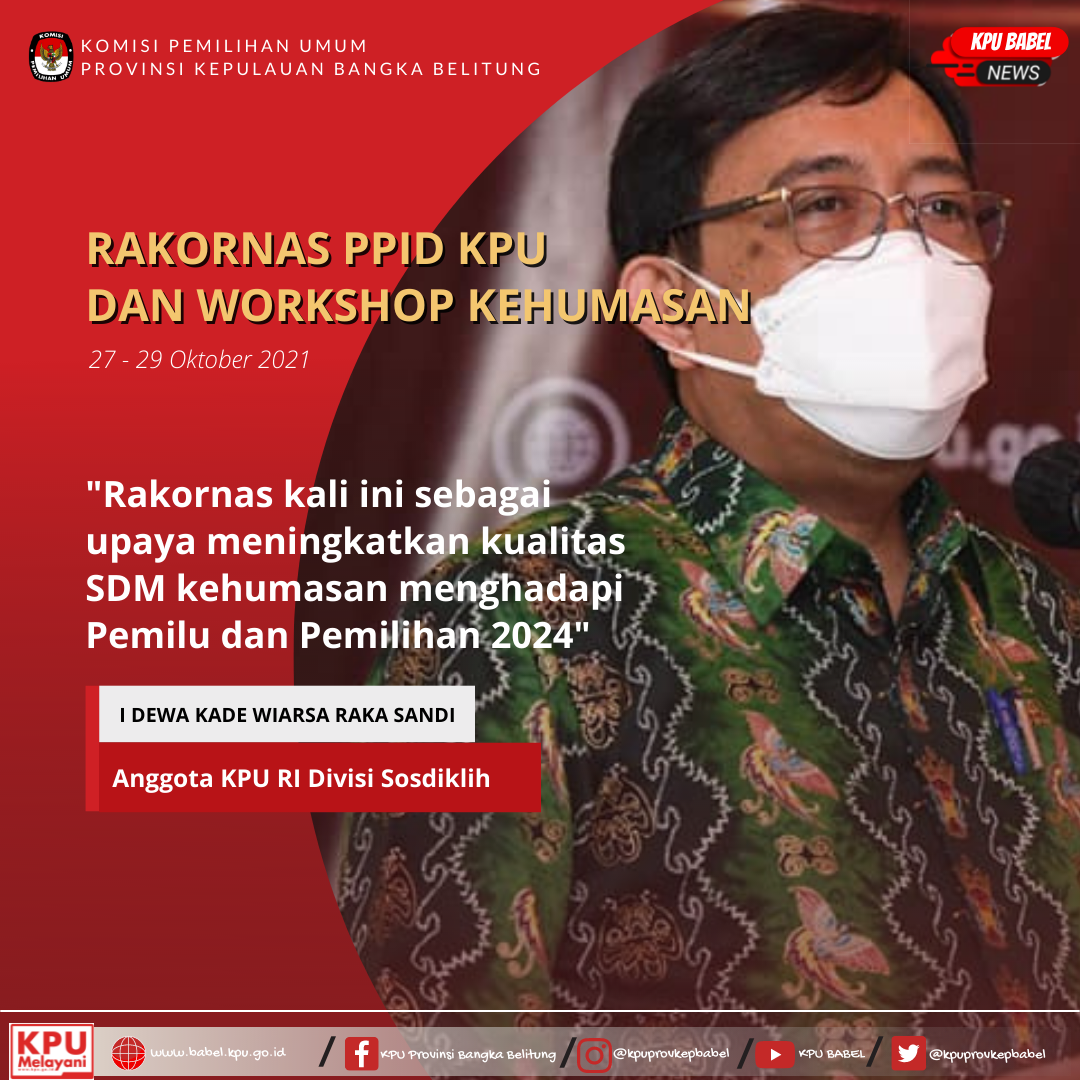 Babel.kpu.go.id - Komisi Pemilihan Umum Republik Indonesia (KPU RI) menyelenggarakan Rapat Koordinasi Nasional (Rakornas) Pejabat Pengelola Informasi dan Dokumentasi (PPID) dan Workshop Kehumasan Tahun 2021 yang diselenggarakan secara luring dan daring dari tanggal 27 Oktober sampai dengan 29 Oktober 2021. Acara Rakornas diikuti oleh peserta yang berasal dari KPU Provinsi dan KPU Kabupaten/Kota seluruh Indonesia.