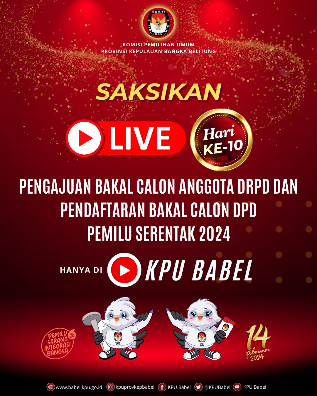 #SeperadikPemilih, saksikan live streaming Penerimaan Dokumen Pengajuan Bakal Calon Anggota DPRD dan Pendaftaran Calon Anggota DPD Provinsi Kepulauan Bangka Belitung untuk Pemilu Serentak Tahun 2024.