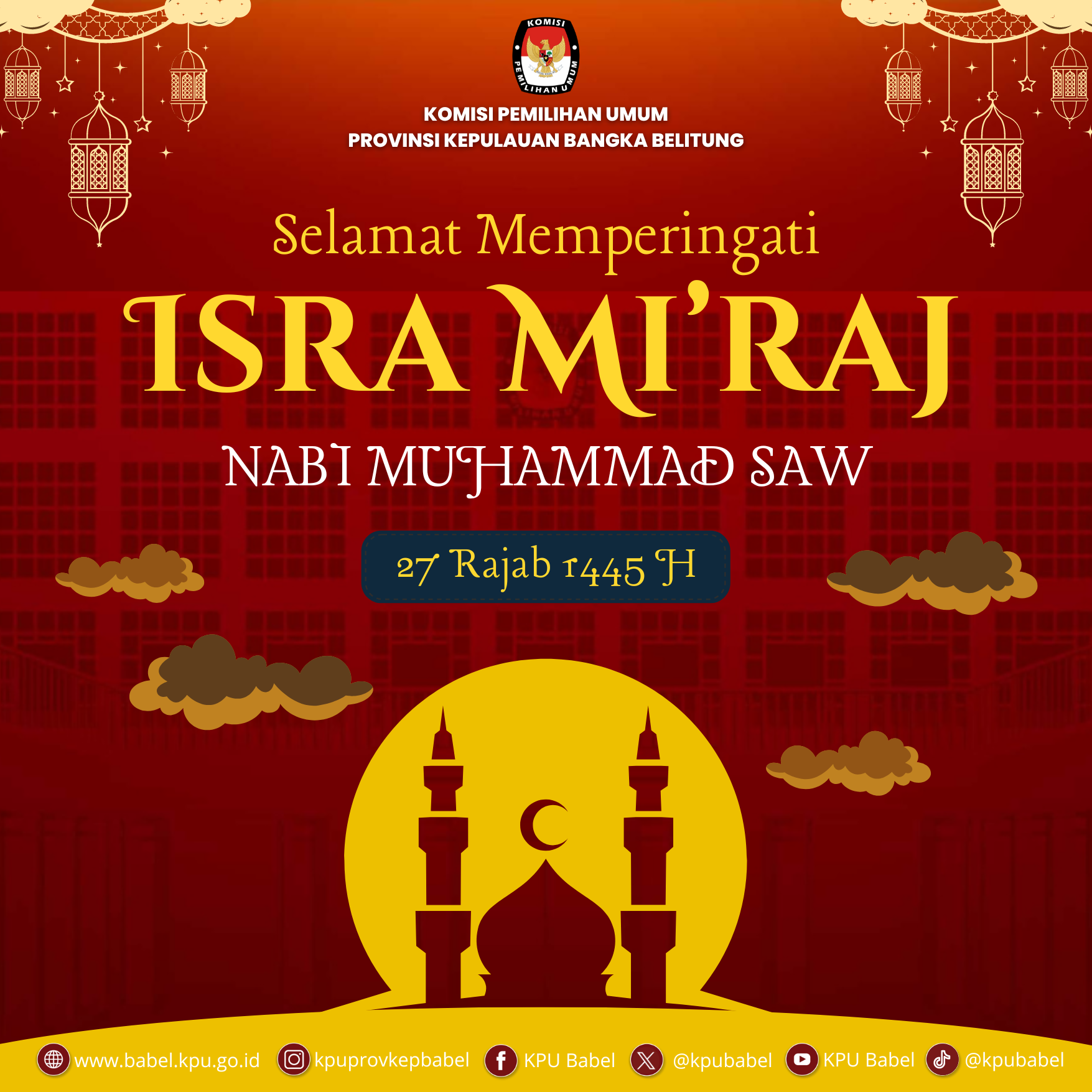 #SeperadikPemilih segenap jajaran KPU Provinsi Kepulauan Bangka Belitung mengucapkan selamat memperingati Hari Isra Mi’raj Nabi Muhammad SAW 1445 Hijriah/ 2024 untuk seluruh umat Islam. Semoga syafaat Nabi Muhammad selalu menyertai kita dan dapat kita jadikan momentum untuk semakin memperbaiki kualitas diri.