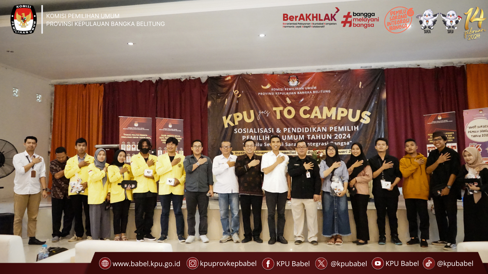 Pangkalpinang, babel.kpu.go.id - Pengoptimalan penyebaran informasi seputar Pemilu 2024 yang menyasar pemilih pemula digencarkan Komisi Pemilihan Umum (KPU) Provinsi Kepulauan Bangka Belitung menjelang kontestasi Pemilu Februari mendatang, kali ini kegiatan Sosialisasi Pendidikan Pemilu 2024 menyasar ratusan mahasiswa di Institut Pahlawan 12 Sungailiat Kabupaten Bangka (24/1).