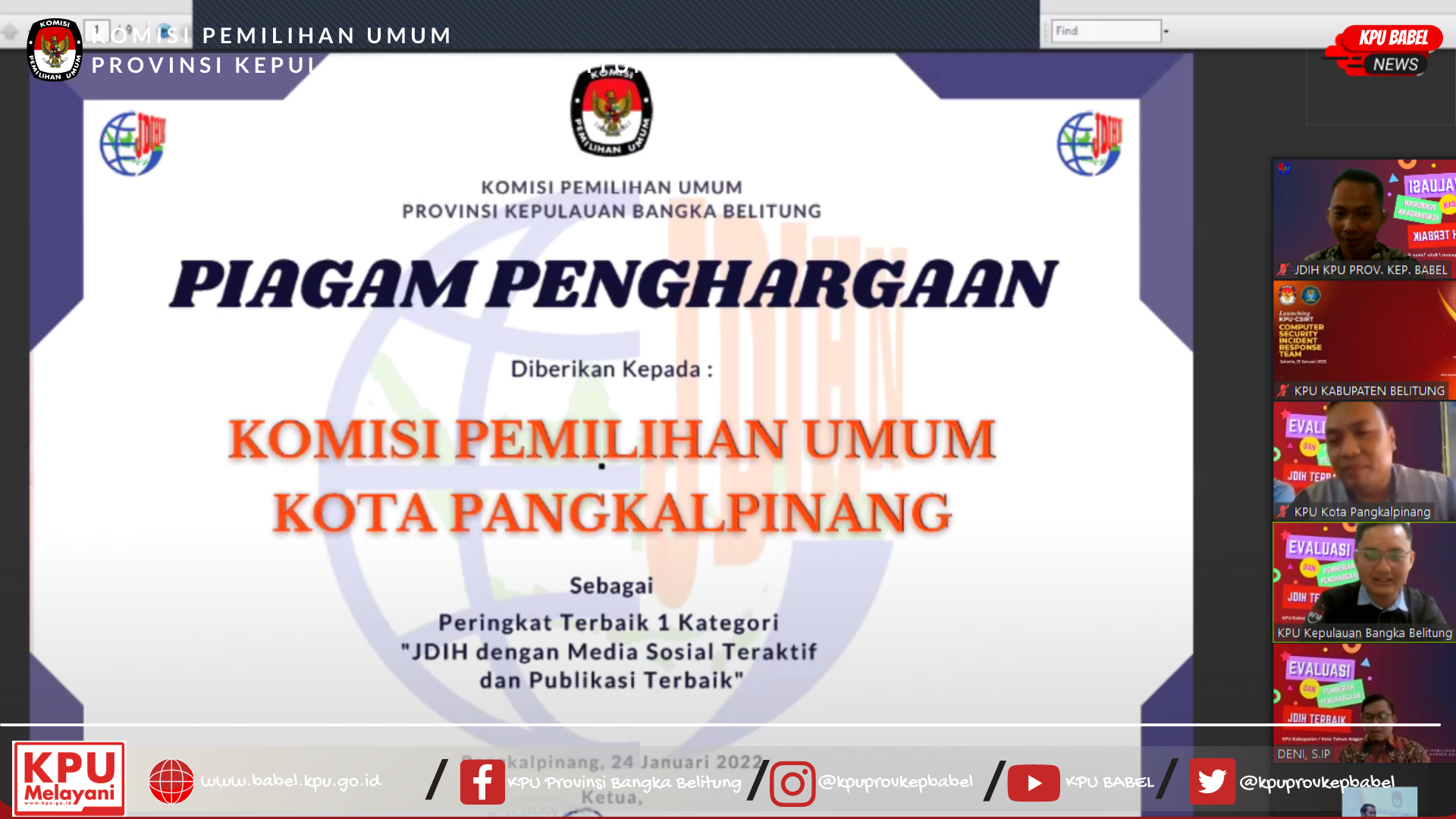 Pangkalpinang (3/2/22), Komisi Pemilihan Umum Provinsi Kepulauan Bangka Belitung menyelenggarakan kegiatan Evaluasi dan Pemberian Penghargaan Pengelolaan Jaringan Dokumentasi dan Informasi Hukum (JDIH) Terbaik Tingkat KPU Kabupaten/Kota Se Provinsi Kepulauan Bangka Belitung Tahun 2021 secara daring via zoom meeting.