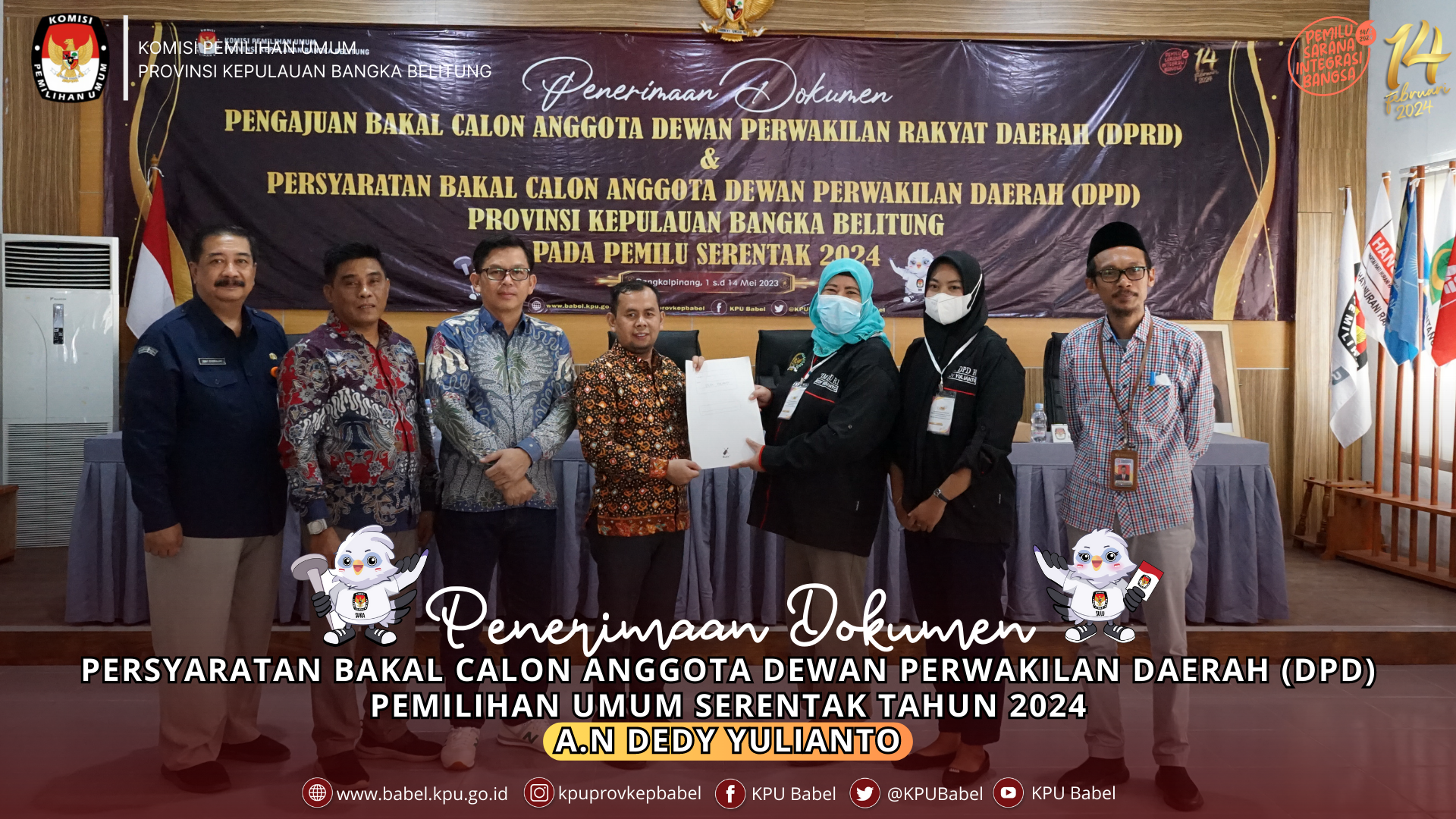 Pangkalpinang, babel.kpu.go.id - #SeperadikPemilih KPU Provinsi Kepulauan Bangka Belitung menerima Dokumen Pendaftaran Persyaratan Bakal Calon Anggota Dewan Perwakilan Daerah (DPD) Pemilu 2024 atas nama Dedy Yulianto bertempat di ruang rapat KPU Babel, Sabtu (13/5)