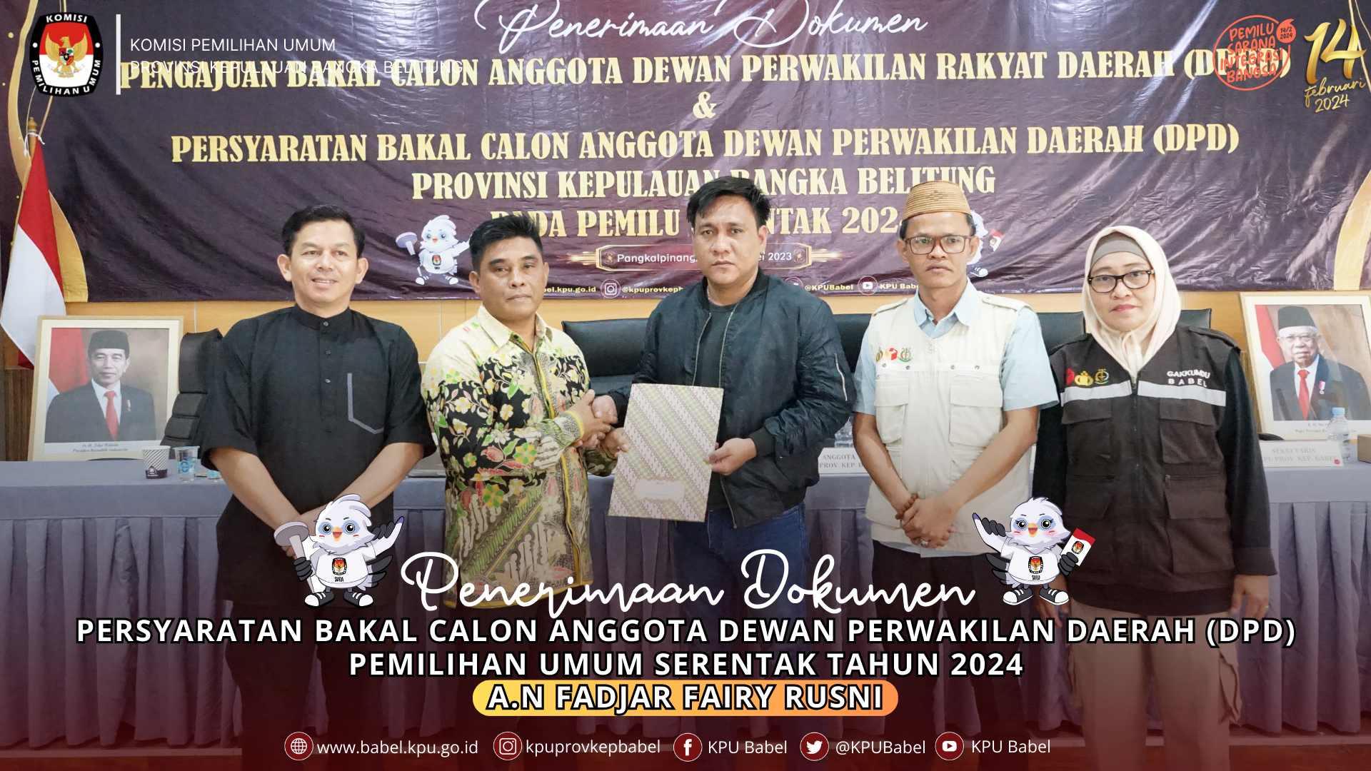 Pangkalpinang, babel.kpu.go.id - #SeperadikPemilih KPU Provinsi Kepulauan Bangka Belitung menerima Dokumen Pendaftaran Persyaratan Bakal Calon Anggota Dewan Perwakilan Daerah (DPD) Pemilu 2024 atas nama Fadjar Fairy Rusni bertempat di ruang rapat KPU Babel, Minggu (14/5)