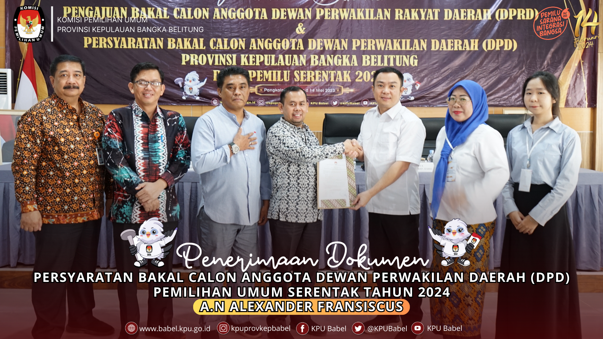 Pangkalpinang, babel.kpu.go.id - #SeperadikPemilih KPU Provinsi Kepulauan Bangka Belitung menerima Dokumen Pendaftaran Persyaratan Bakal Calon Anggota Dewan Perwakilan Daerah (DPD) Pemilu 2024 atas nama Alexander Fransiscus bertempat di ruang rapat KPU Babel, Jumat (12/5)