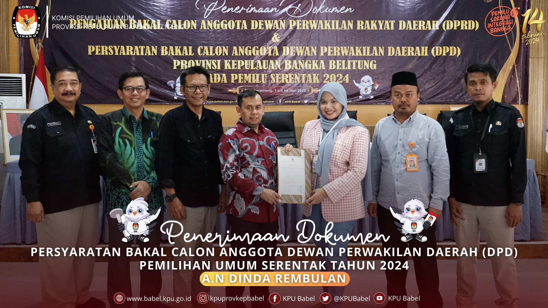 Pangkalpinang, babel.kpu.go.id - #SeperadikPemilih KPU Provinsi Kepulauan Bangka Belitung menerima Dokumen Pendaftaran Persyaratan Bakal Calon Anggota Dewan Perwakilan Daerah (DPD) Pemilu 2024 atas nama Dinda Rembulan bertempat di ruang rapat KPU Babel, Rabu (10/5)