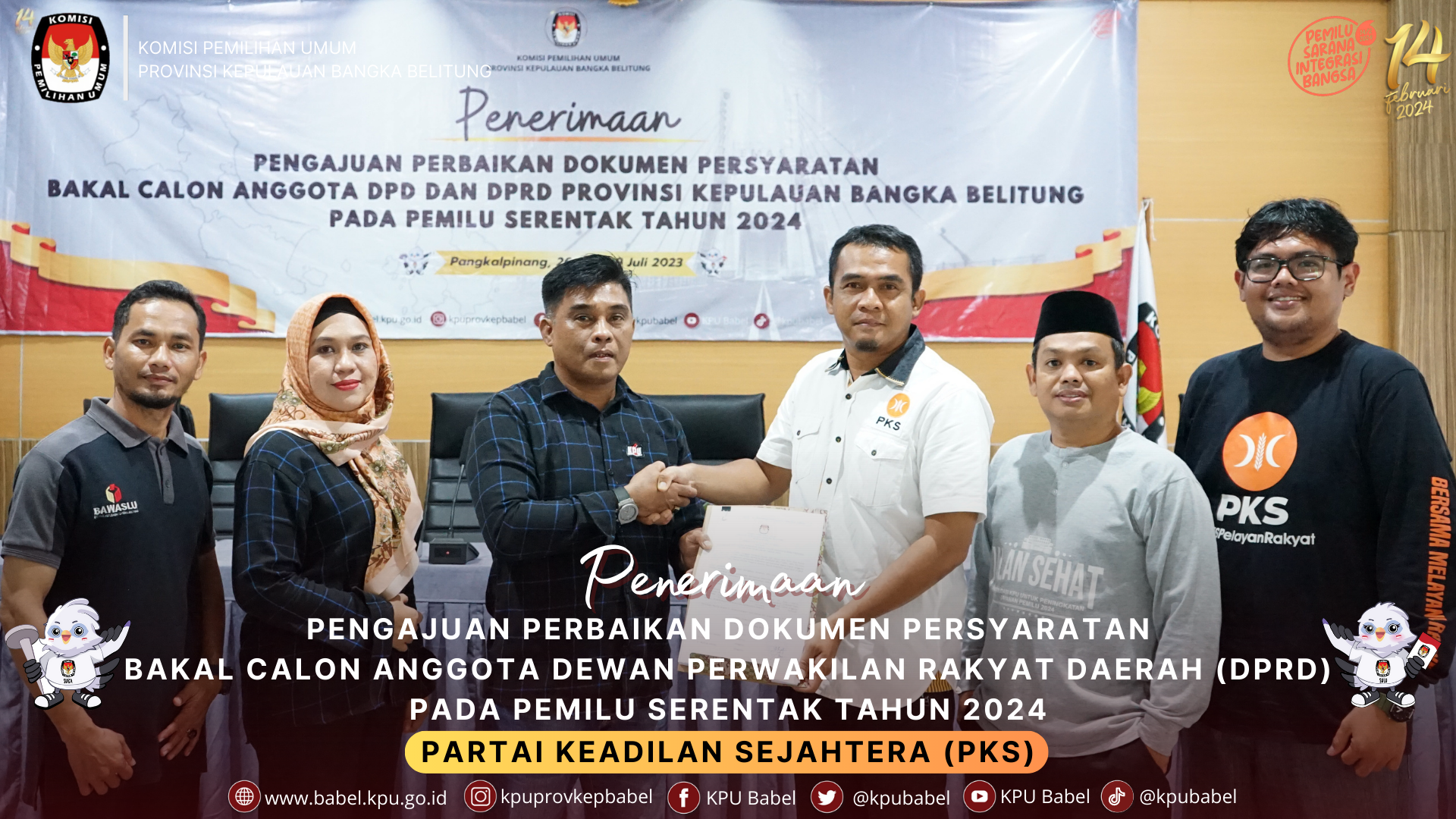 Pangkalpinang, babel.kpu.go.id - #SeperadikPemilih KPU Provinsi Kepulauan Bangka Belitung menerima Pengajuan Perbaikan Dokumen Persyaratan Bakal Calon Anggota Dewan Perwakilan Rakyat Daerah (DPRD) Pemilu 2024 dari Partai PKS bertempat di ruang rapat KPU Babel, Sabtu (8/7)