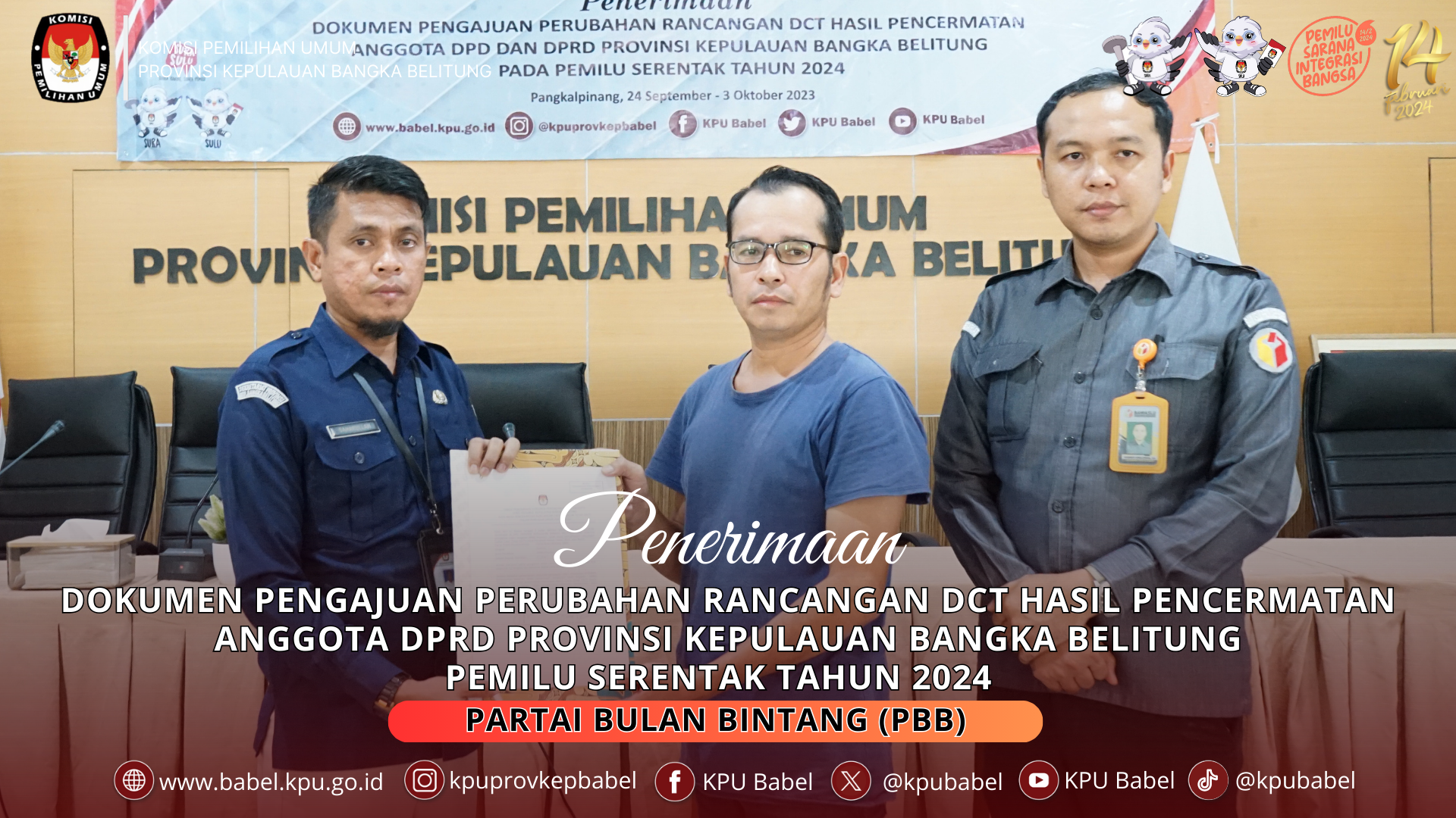 Pangkalpinang, babel.kpu.go.id - #SeperadikPemilih KPU Provinsi Kepulauan Bangka Belitung menerima Dokumen Pengajuan Perubahan Rancangan Daftar Calon Tetap (DCT) Hasil Pencermatan Anggota Dewan Perwakilan Rakyat Daerah (DPRD) Pemilu 2024 dari Partai Bulan Bintang bertempat di ruang rapat KPU Babel, Selasa (3/10)