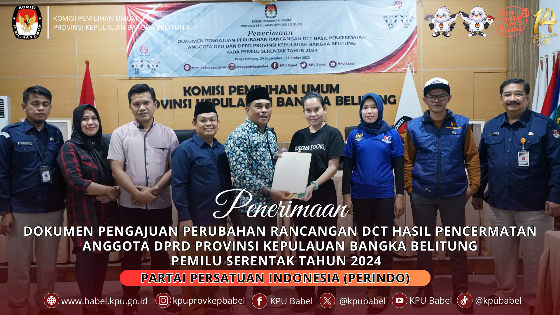 Pangkalpinang, babel.kpu.go.id - #SeperadikPemilih KPU Provinsi Kepulauan Bangka Belitung menerima Dokumen Pengajuan Perubahan Rancangan Daftar Calon Tetap (DCT) Hasil Pencermatan Anggota Dewan Perwakilan Rakyat Daerah (DPRD) Pemilu 2024 dari Partai Perindo bertempat di ruang rapat KPU Babel, Selasa (3/10)
