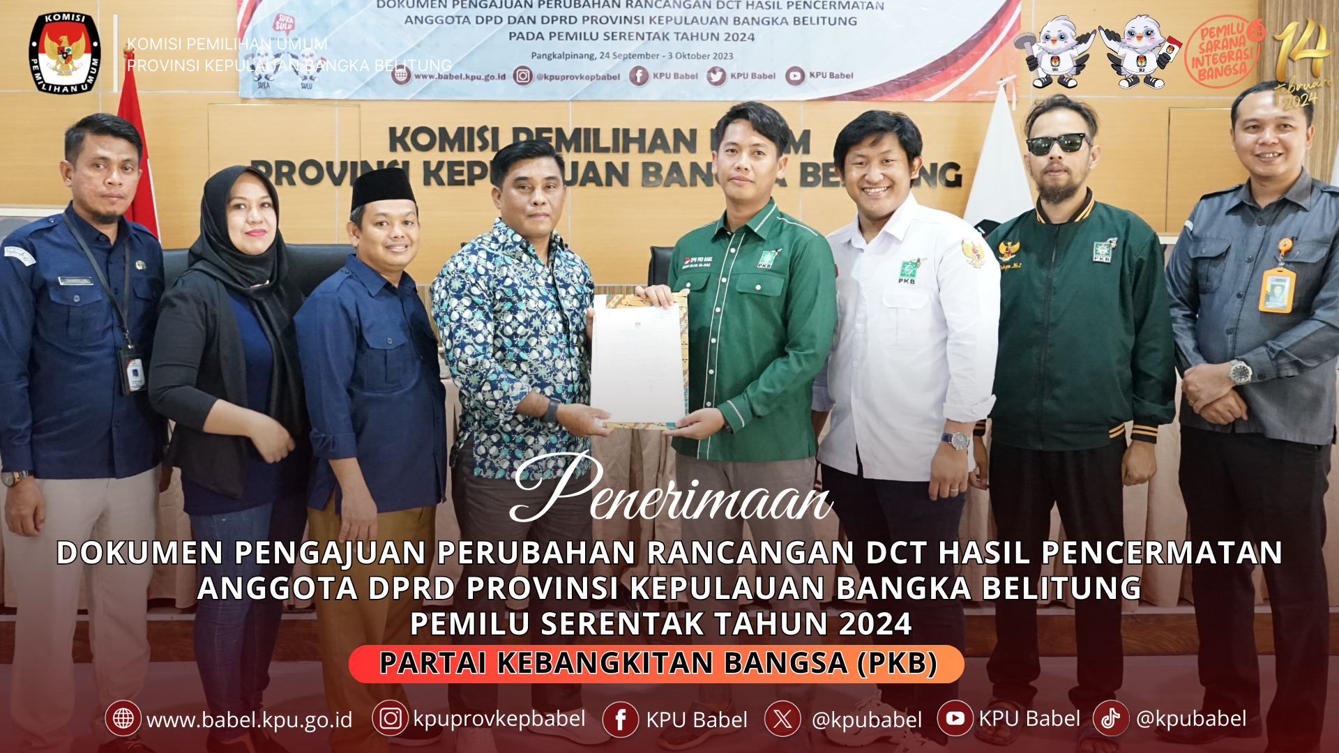 Pangkalpinang, babel.kpu.go.id - #SeperadikPemilih KPU Provinsi Kepulauan Bangka Belitung menerima Dokumen Pengajuan Perubahan Rancangan Daftar Calon Tetap (DCT) Hasil Pencermatan Anggota Dewan Perwakilan Rakyat Daerah (DPRD) Pemilu 2024 dari Partai PKB bertempat di ruang rapat KPU Babel, Selasa (3/10)