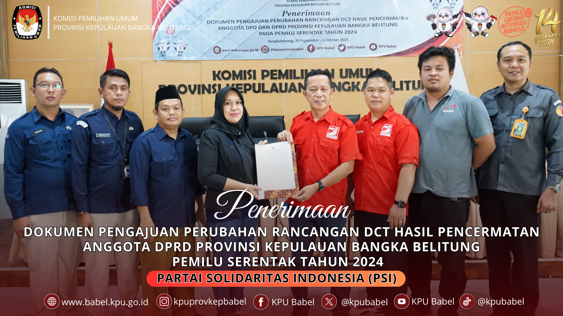 Pangkalpinang, babel.kpu.go.id - #SeperadikPemilih KPU Provinsi Kepulauan Bangka Belitung menerima Dokumen Pengajuan Perubahan Rancangan Daftar Calon Tetap (DCT) Hasil Pencermatan Anggota Dewan Perwakilan Rakyat Daerah (DPRD) Pemilu 2024 dari Partai PSI bertempat di ruang rapat KPU Babel, Selasa (3/10)