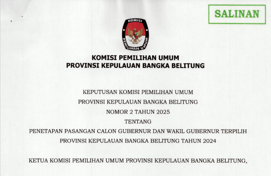 #SeperadikPemilih Pengumuman Keputusan KPU Provinsi Kepulauan Bangka Belitung Nomor 02 Tahun 2025 Tentang Penetapan Pasangan Calon Gubernur dan Wakil Gubernur Terpilih Provinsi Kepulauan Bangka Belitung Tahun 2024.