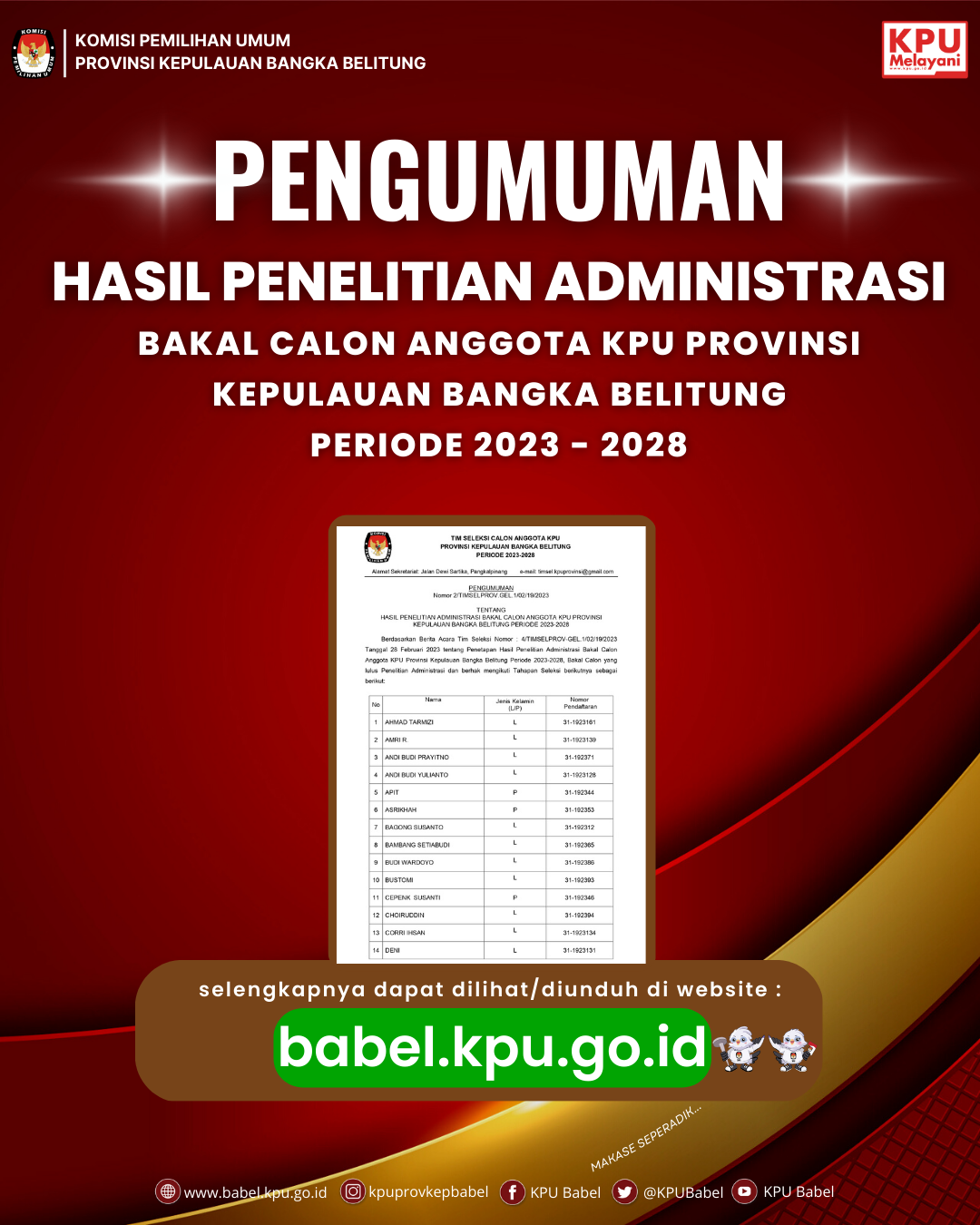 #SeperadikPemilih, Berikut Pengumuman Penetapan Hasil Penelitian Administrasi Bakal Calon Anggota Komisi Pemilihan Umum Provinsi Kepulauan Bangka Belitung Periode 2023-2028.