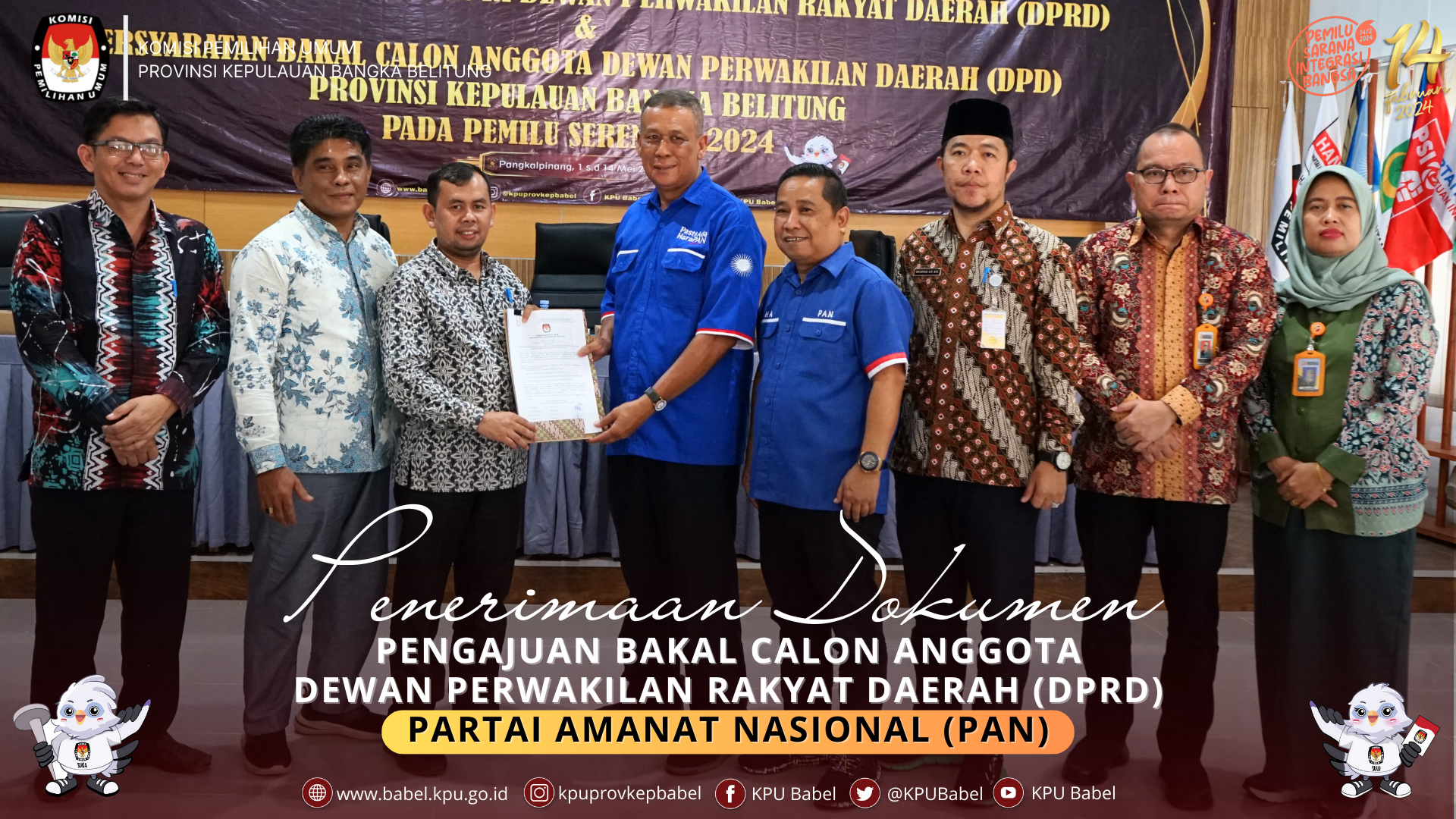 #SeperadikPemilih, KPU Babel menerima kehadiran Partai Amanat Nasional (PAN) dalam rangka Pengajuan Bakal Calon Anggota Dewan Perwakilan Rakyat (DPRD) Provinsi Kepulauan Bangka Belitung dalam Pemilu Tahun 2024 di Ruang Rapat Sekretariat KPU Babel, Jumat (12/05).