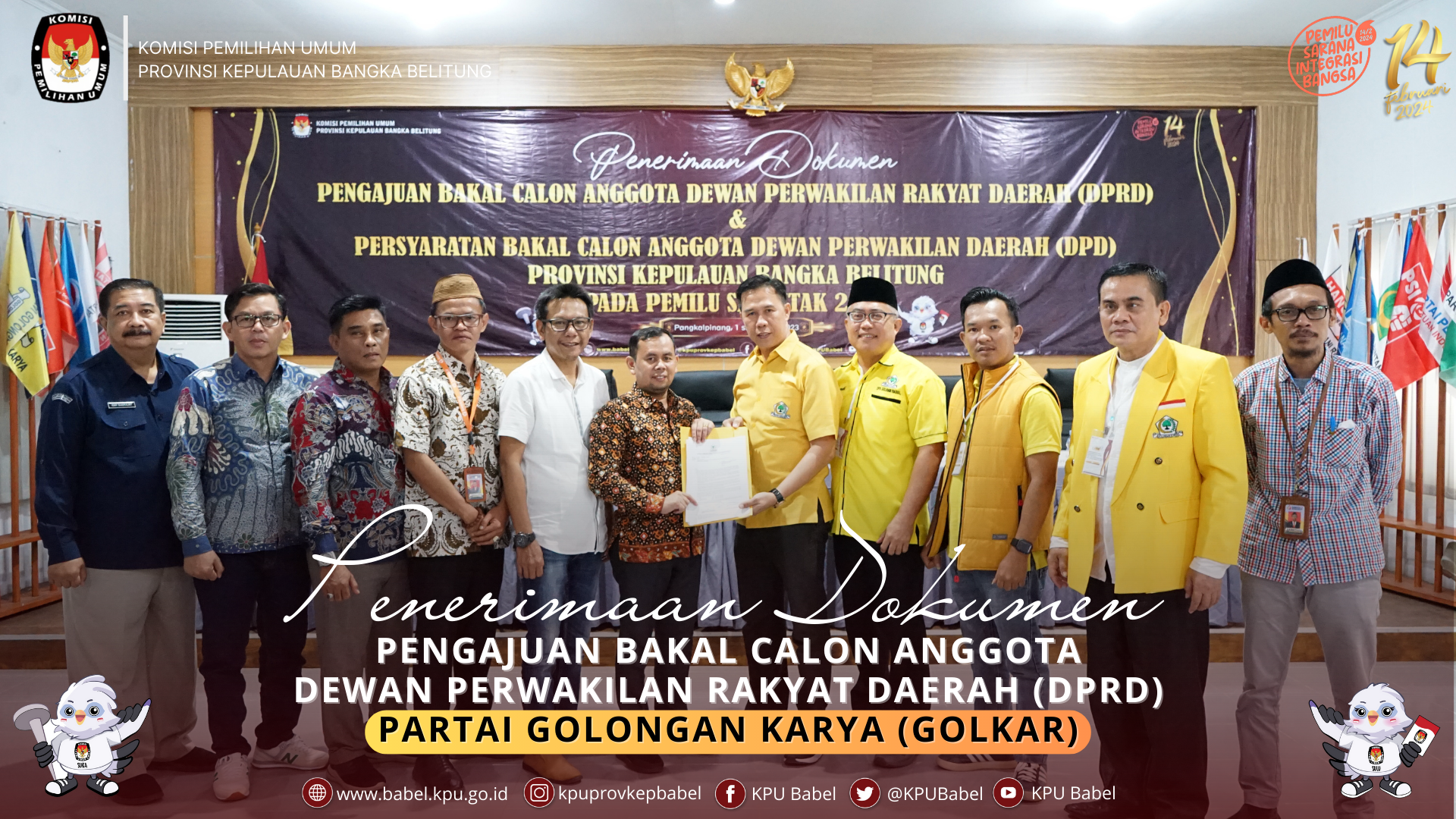 #SeperadikPemilih, KPU Babel menerima kehadiran Partai Golongan Karya (Golkar) dalam rangka Pengajuan Bakal Calon Anggota Dewan Perwakilan Rakyat (DPRD) Provinsi Kepulauan Bangka Belitung dalam Pemilu Tahun 2024 di Ruang Rapat Sekretariat KPU Babel, Sabtu (13/05).