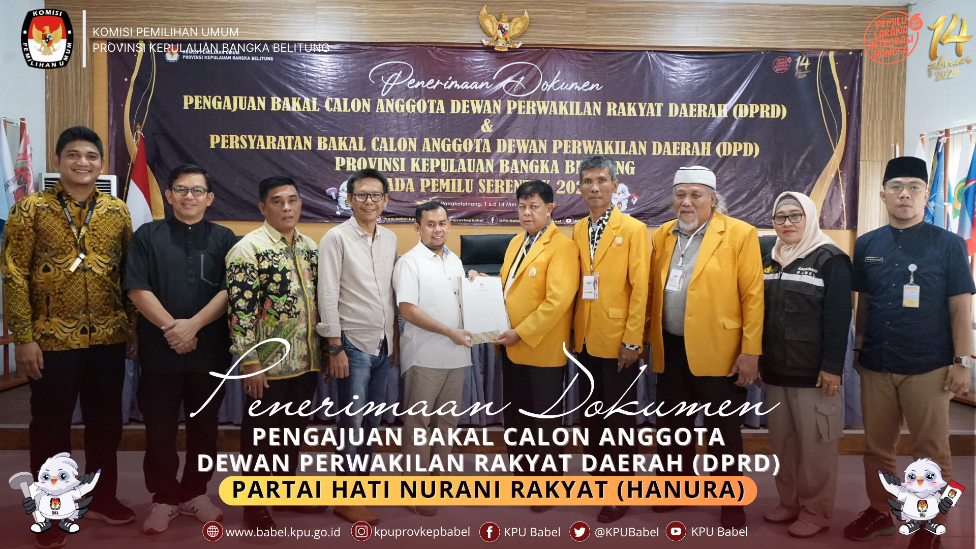 #SeperadikPemilih, KPU Babel menerima kehadiran Partai Hati Nurani Rakyat (Hanura) dalam rangka Pengajuan Bakal Calon Anggota Dewan Perwakilan Rakyat (DPRD) Provinsi Kepulauan Bangka Belitung dalam Pemilu Tahun 2024 di Ruang Rapat Sekretariat KPU Babel, Minggu (14/05).