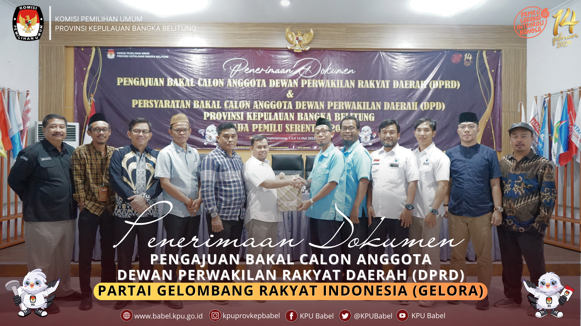 #SeperadikPemilih, KPU Babel menerima kehadiran Partai Gelombang Rakyat Indonesia (Gelora) dalam rangka Pengajuan Bakal Calon Anggota Dewan Perwakilan Rakyat (DPRD) Provinsi Kepulauan Bangka Belitung dalam Pemilu Tahun 2024 di Ruang Rapat Sekretariat KPU Babel, Minggu (14/05).