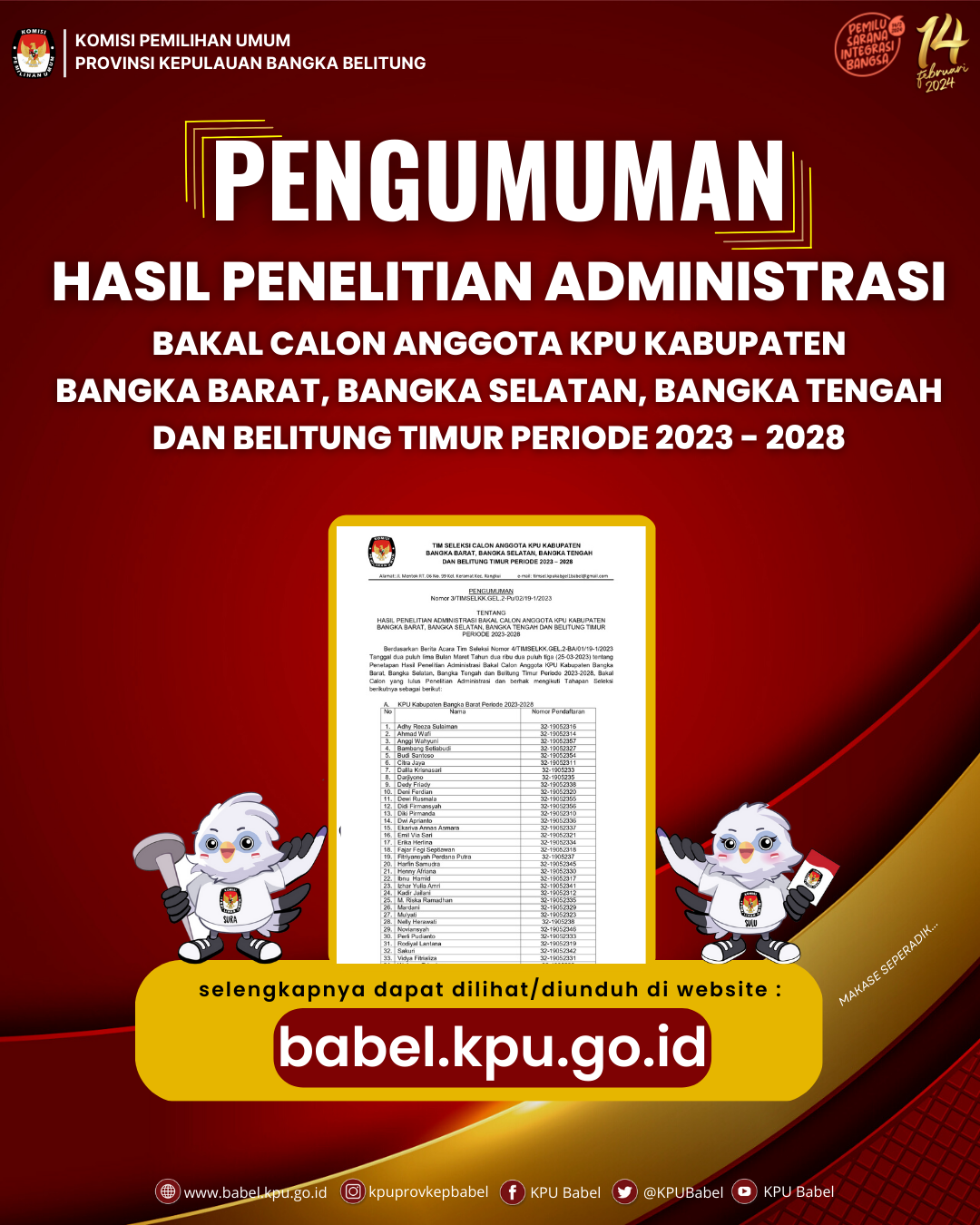#SeperadikPemilih Berikut Pengumuman Hasil Penelitian Administrasi Bakal Calon Anggota KPU Kabupaten Bangka Barat, Bangka Selatan, Bangka Tengah dan Belitung Timur Periode 2023-2028