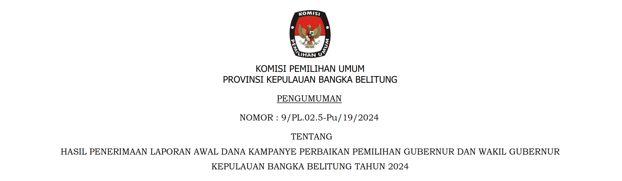 #SeperadikPemilih, berikut kami sampaikan Pengumuman Hasil Penerimaan Laporan Awal Dana Kampanye Perbaikan Pemilihan Gubernur dan Wakil Gubernur Kepulauan Bangka Belitung Tahun 2024.