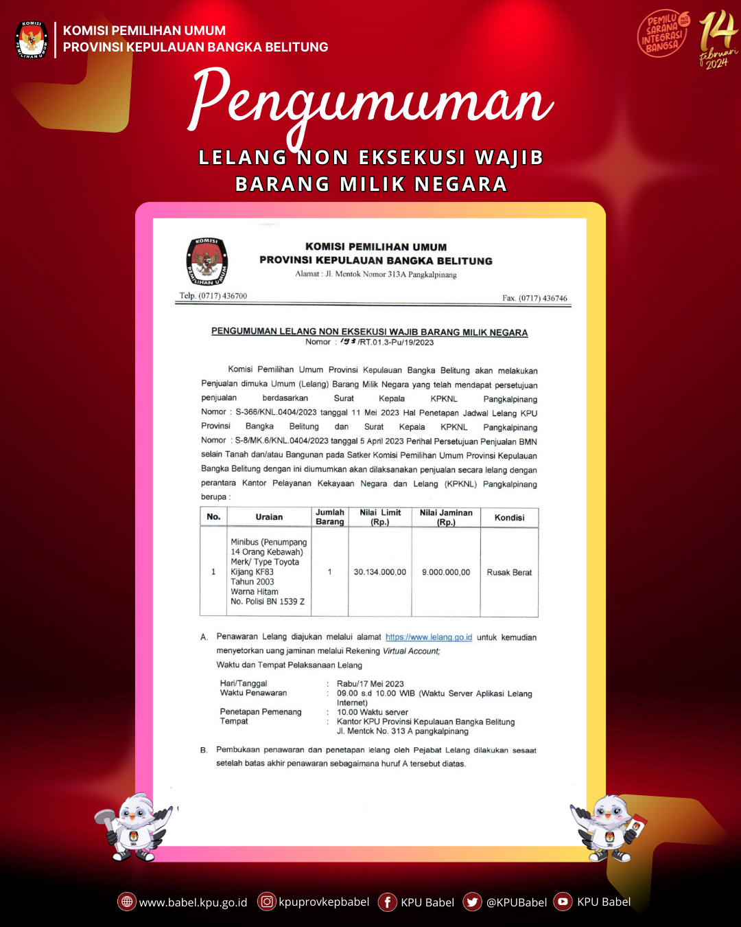 PENGUMUMAN LELANG NON EKSEKUSI KPU BABEL