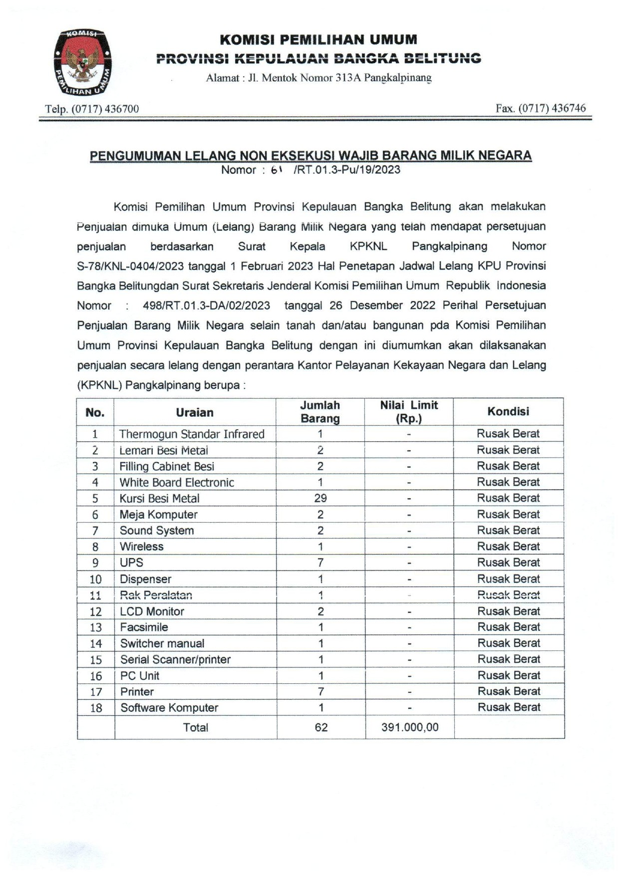 #SeperadikPemilih, KPU Provinsi Kepulauan Bangka Belitung melakukan Penjualan dimuka umum (lelang) Barang Milik Negara yang telah mendapat persetujuan penjualan berdasarkan surat kepala KPKNL Pangkalpinang Nomor S-27/KNL-0404/2023 tanggal 1 Februari 2023.