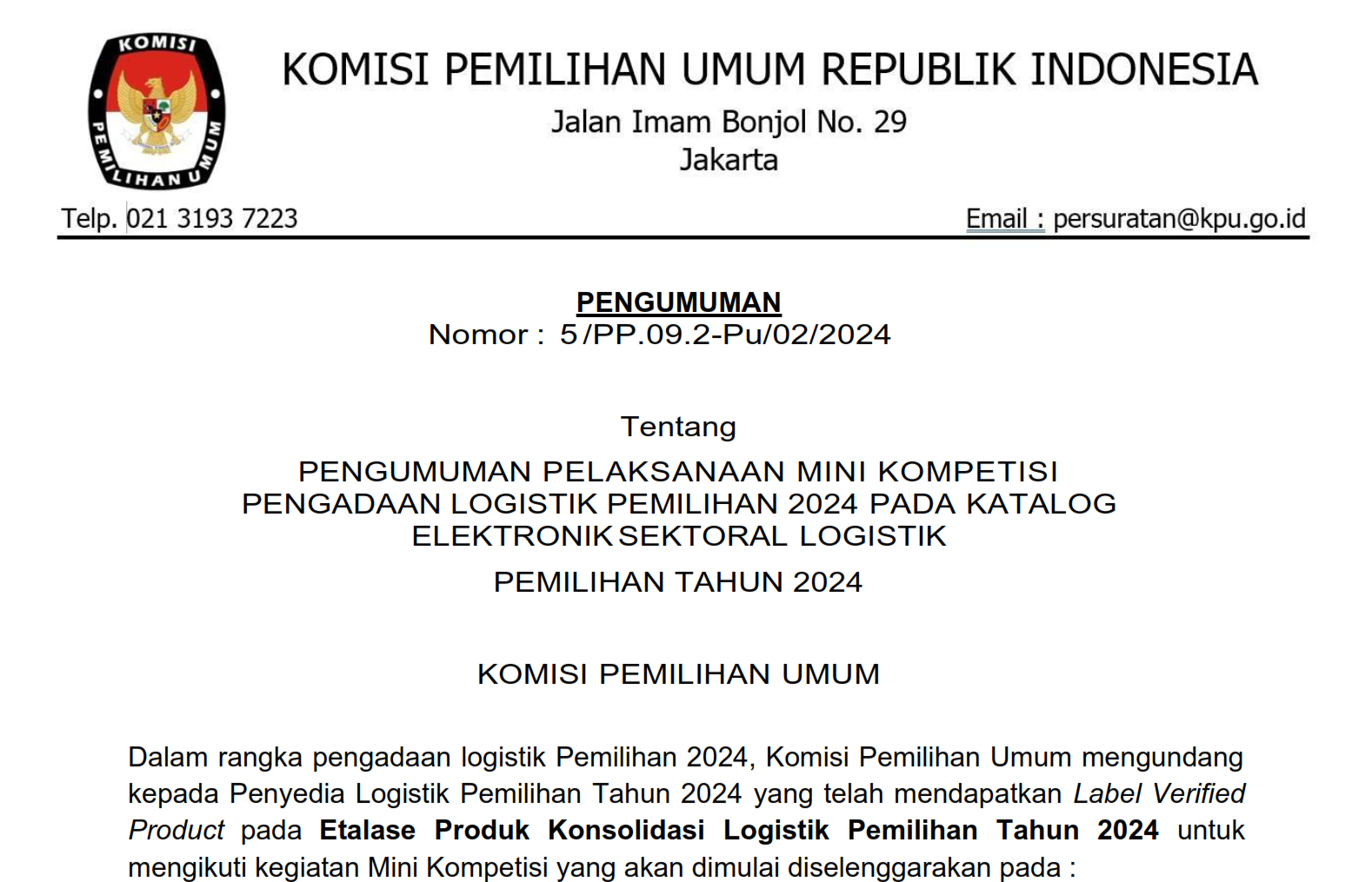 #SeperadikPemilih Dalam rangka pengadaan logistik Pemilihan 2024, Komisi Pemilihan Umum mengundang kepada Penyedia Logistik Pemilihan Tahun 2024 yang telah mendapatkan Label Verified Product pada Etalase Produk Konsolidasi Logistik Pemilihan Tahun 2024.