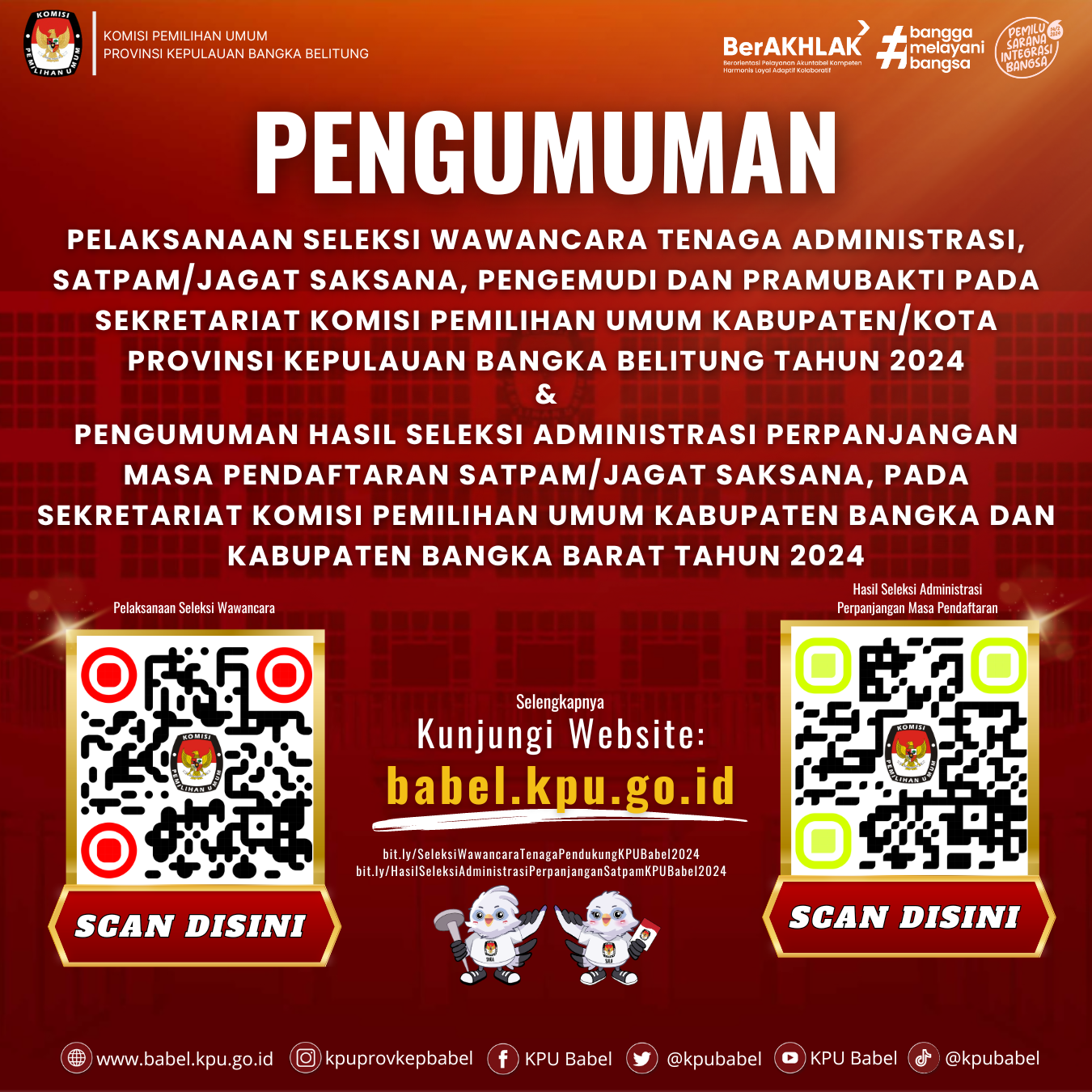 #SeperadikPemilih, Berikut kami sampaikan pelaksanaan Seleksi wawancara Tenaga Administrasi, Satpam/Jagat Saksana,Pengemudi dan Pramubakti Pada Sekretariat Komisi Pemilihan Umum Kabupaten/Kota di Provinsi Kepulauan Bangka Belitung Tahun 2024 dan Pengumuman hasil Seleksi Administrasi Perpanjangan Masa Pendaftaran Satpam/Jagat Saksana Pada Sekretariat Komisi Pemilihan Umum Kabupaten Bangka dan Kabupaten Bangka Barat.