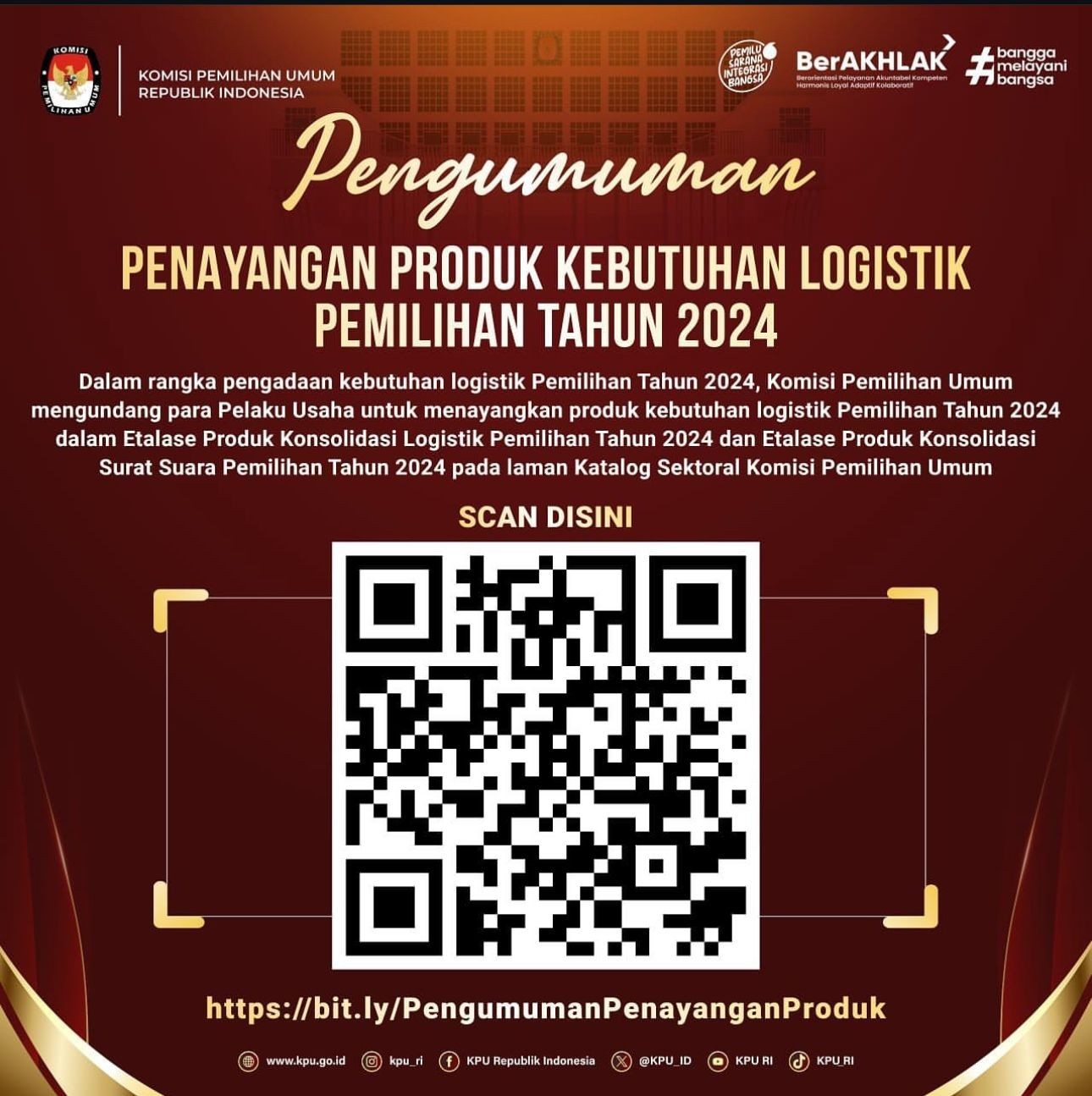 Berikut disampaikan Pengumuman Penayangan Produk Kebutuhan Logistik Pemilihan Tahun 2024, untuk informasi lebih lengkap silahkan klik di sini atau dapat men-scan barcode pada gambar.