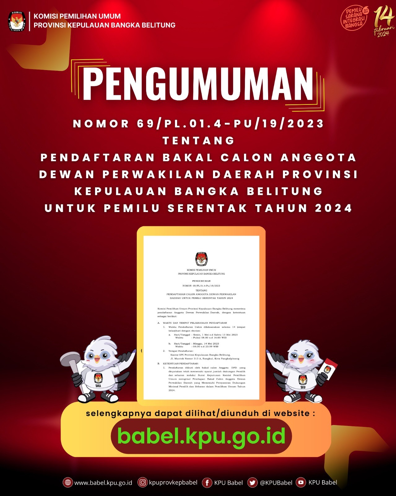 #SeperadikPemilih Pengumuman Nomor 69/PL.01.4-PU/19/2023 tentang Pendaftaran Bakal Calon Anggota Dewan Perwakilan Daerah (DPD) Provinsi Kepulauan Bangka Belitung Untuk Pemilu Serentak Tahun 2024.