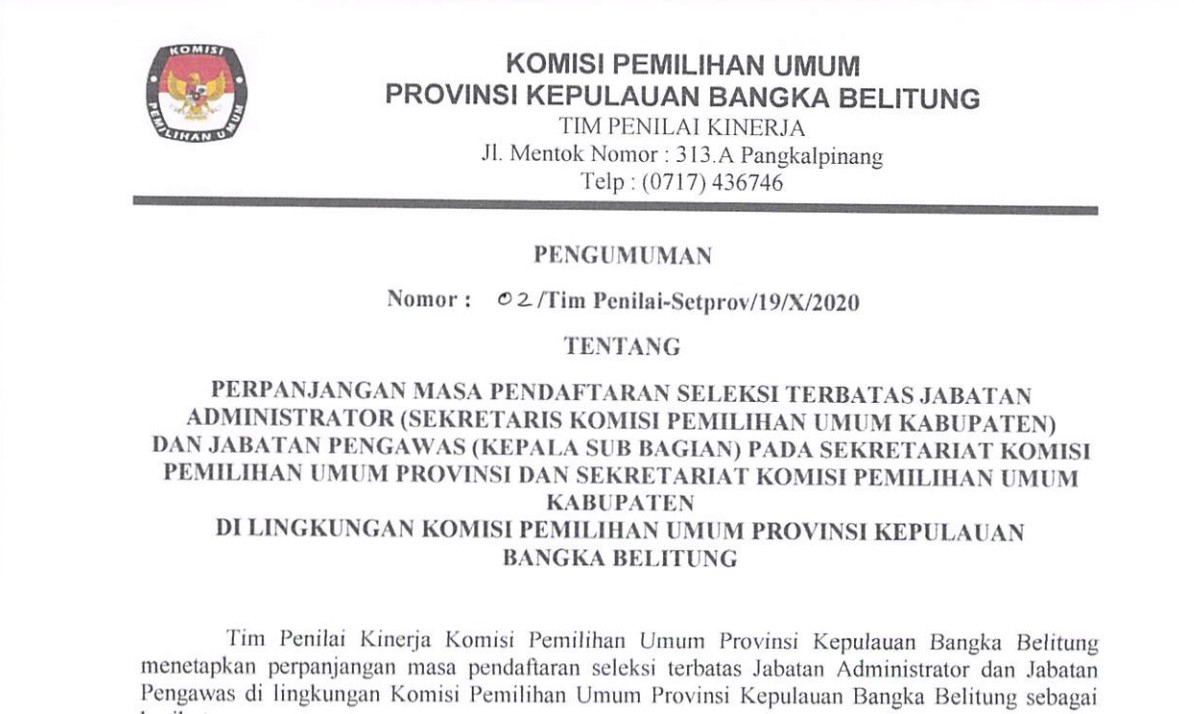 PENGUMUMAN PERPANJANGAN SELEKSI TERBATAS JABATAN ADMINISTRATOR DAN JABATAN PENGAWAS PADA SEKRETARIAT KPU PROVINSI DAN KPU KABUPATEN DI LINGKUNGAN KOMISI PEMILIHAN UMUM PROVINSI KEPULAUAN BANGKA BELITUNG.