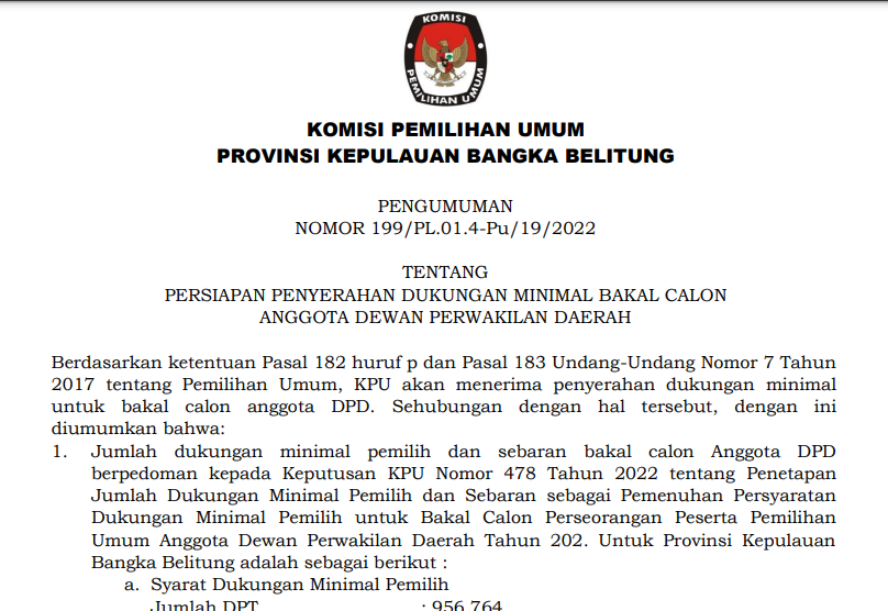 PENGUMUMAN PERSIAPAN PENYERAHAN DUKUNGAN MINIMAL BAKAL CALON ANGGOTA DPD