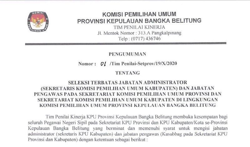 PENGUMUMAN SELEKSI TERBATAS JABATAN ADMINISTRATOR DAN JABATAN PENGAWAS PADA SEKRETARIAT KPU PROVINSI DAN KPU KABUPATEN DI LINGKUNGAN KOMISI PEMILIHAN UMUM PROVINSI KEPULAUAN BANGKA BELITUNG.
