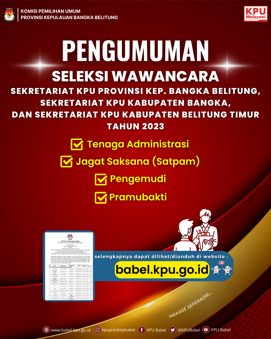 #SeperadikPemilih berikut Pengumuman terkait Pelaksanaan Seleksi Wawancara Tenaga Administrasi, Satpam, Pengemudi dan Pramubakti pada Sekretariat KPU Provinsi Bangka Belitung, Sekretariat KPU Kabupaten Bangka dan Sekretariat KPU Kabupaten Belitung Timur Tahun 2023.