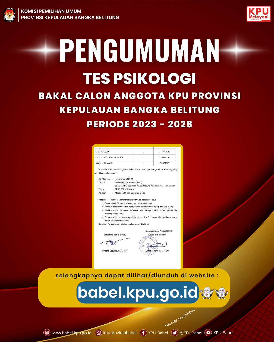 #SeperadikPemilih, Berikut Pengumuman Pelaksanaan Tes Psikologi Bakal Calon Anggota Komisi Pemilihan Umum Provinsi Kepulauan Bangka Belitung Periode 2023-2028.